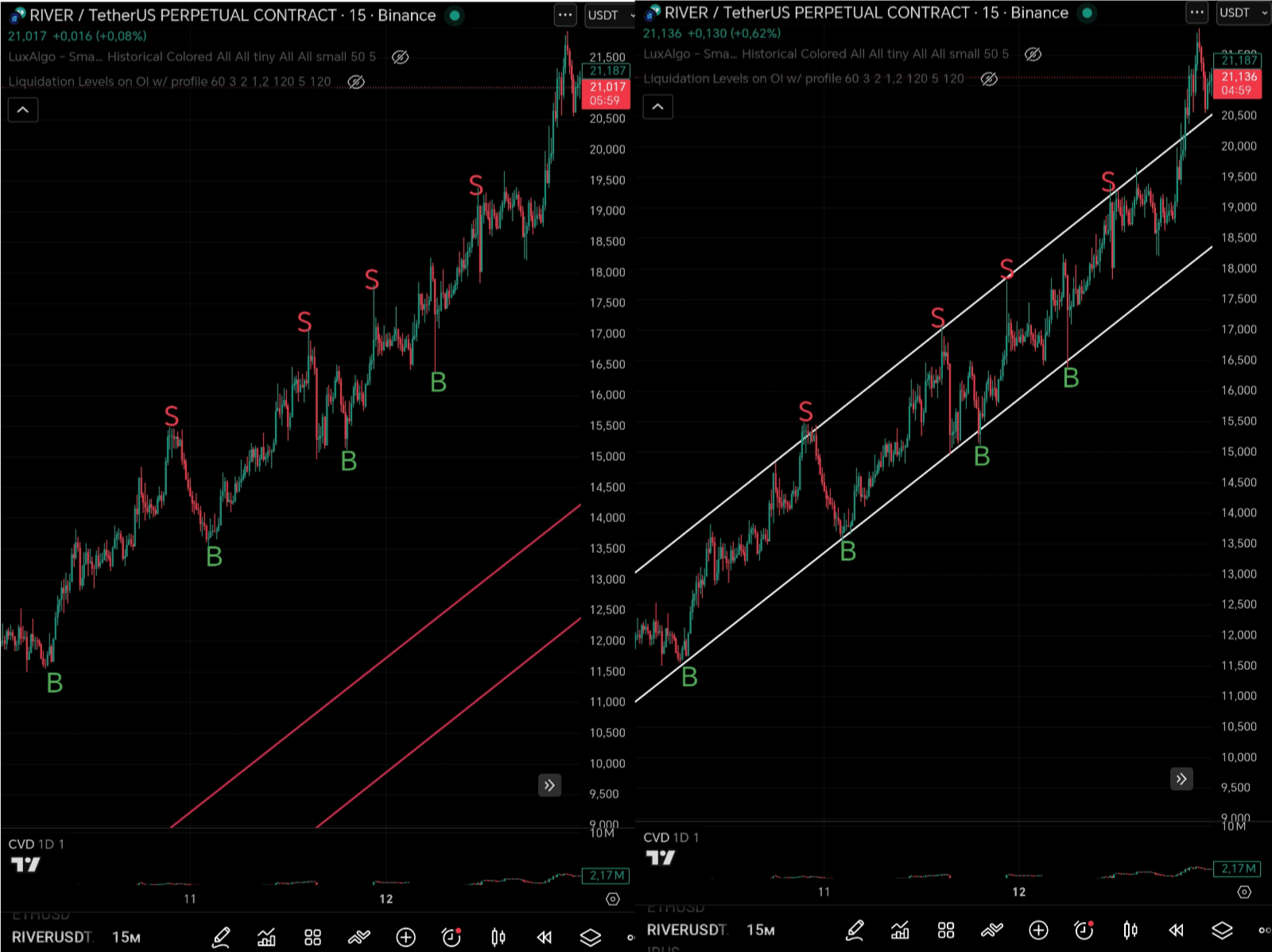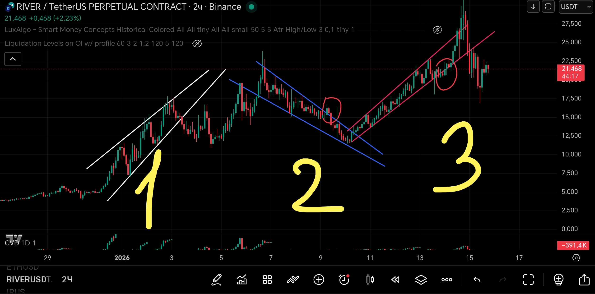 Canale 2 (In discesa): Prima c'era stata una lunga correzione e diverse onde di crescita. Nel cerchio rosso - TRAPPOLA PER LONG 🛑. La candela verde ha iniziato a rompere la trend line, e anche io sono entrata in long! 😂 Ma è proprio per questo che è importante lo STOP-LOSS e spostarlo in pareggio.