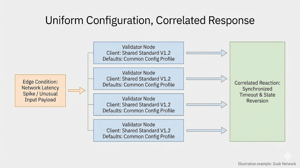 Poi appare improvvisamente una piccola condizione particolare. Non un attacco. Non un fallimento drammatico. Un problema di dipendenza, una partizione di rete, uno scostamento dell'orologio, un aggiornamento di routine che si comporta leggermente diversamente sotto carico. Il tipo di cosa che ti aspetti che un comitato decentralizzato Dusk possa assorbire grazie alla diversità.