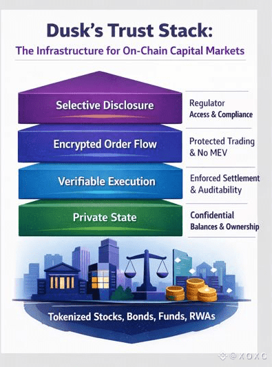 Dusk’s Trust Stack exists because of that wall. It is not a privacy layer added to DeFi. It is not a zk rollup. It is not a compliance tool bolted onto a public chain. It is a purpose-built financial trust architecture designed to let regulated assets live onchain without breaking the rules that make markets function.