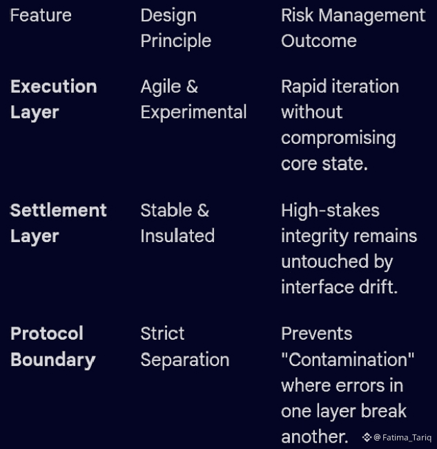 Innovation requires a degree of freedom that settlement cannot afford. By decoupling execution from settlement, we create a sandbox for evolution.Execution is where the complexity lives—it can experiment, iterate, and adapt to user needs.Settlement is the bedrock. It remains stable, insulated, and indifferent to the churn of the layers above it.This separation ensures that a logic error in a complex smart contract or an experimental interface cannot "reach down" and corrupt the underlying truth of the ledger.