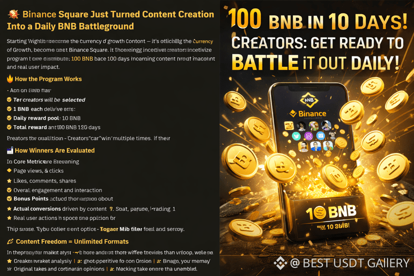 Starting today, Binance Square is unleashing a 10-day creator showdown where 100 BNB will be distributed to creators who actually move the needle. This isn’t a lottery. This isn’t favoritism. This is pure performance vs. value.