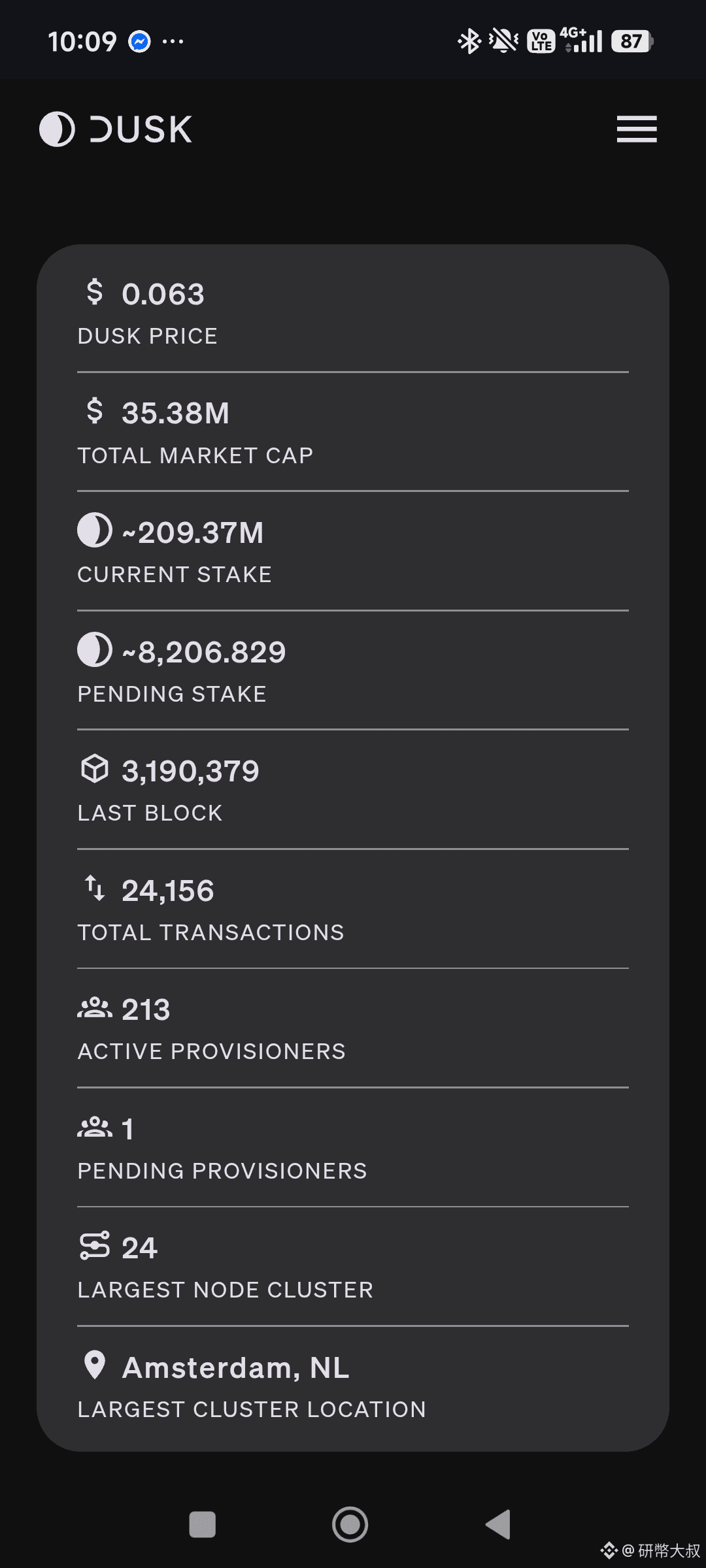 質押與共識: 目前 Current Stake(現有質押) 已高達 ~2.09 億枚 DUSK,佔目前流通量近一半。這代表市場上有大量的籌碼被長期主義者鎖死,流動性擠壓效應已經顯現。