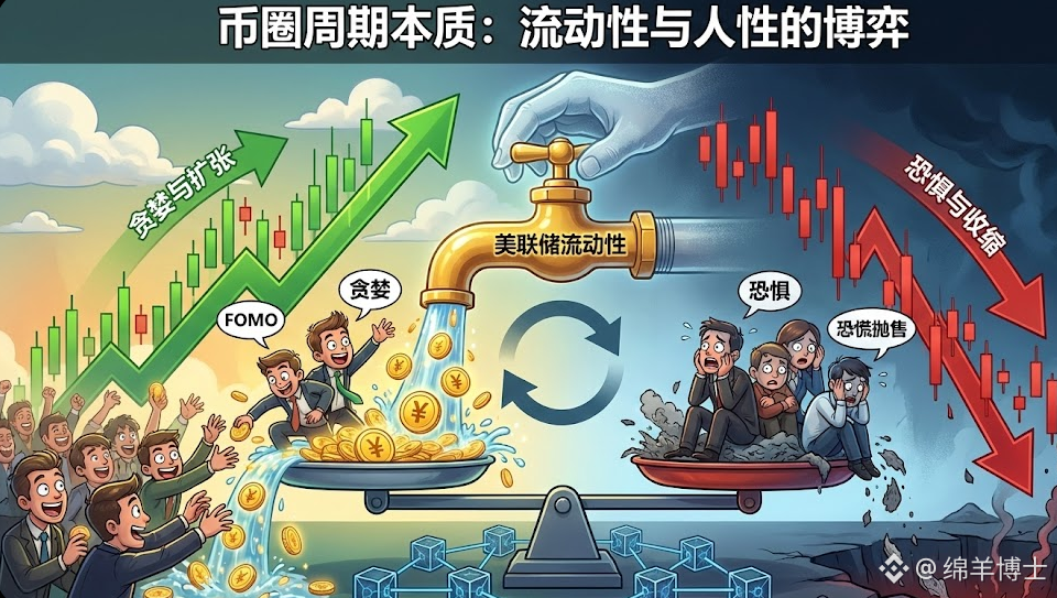 在加密货币这个充满财富神话也遍布陷阱的战场上,我见过太多人因为一时的狂热冲进高位,也见过太多人在黎明前的黑暗中绝望割肉。其实,币圈并不是一个毫无规律的随机乱数发生器,它有着极强的周期性。这种周期,是人性贪婪与恐惧的交替,也是全球流动性扩张与收缩的映射。