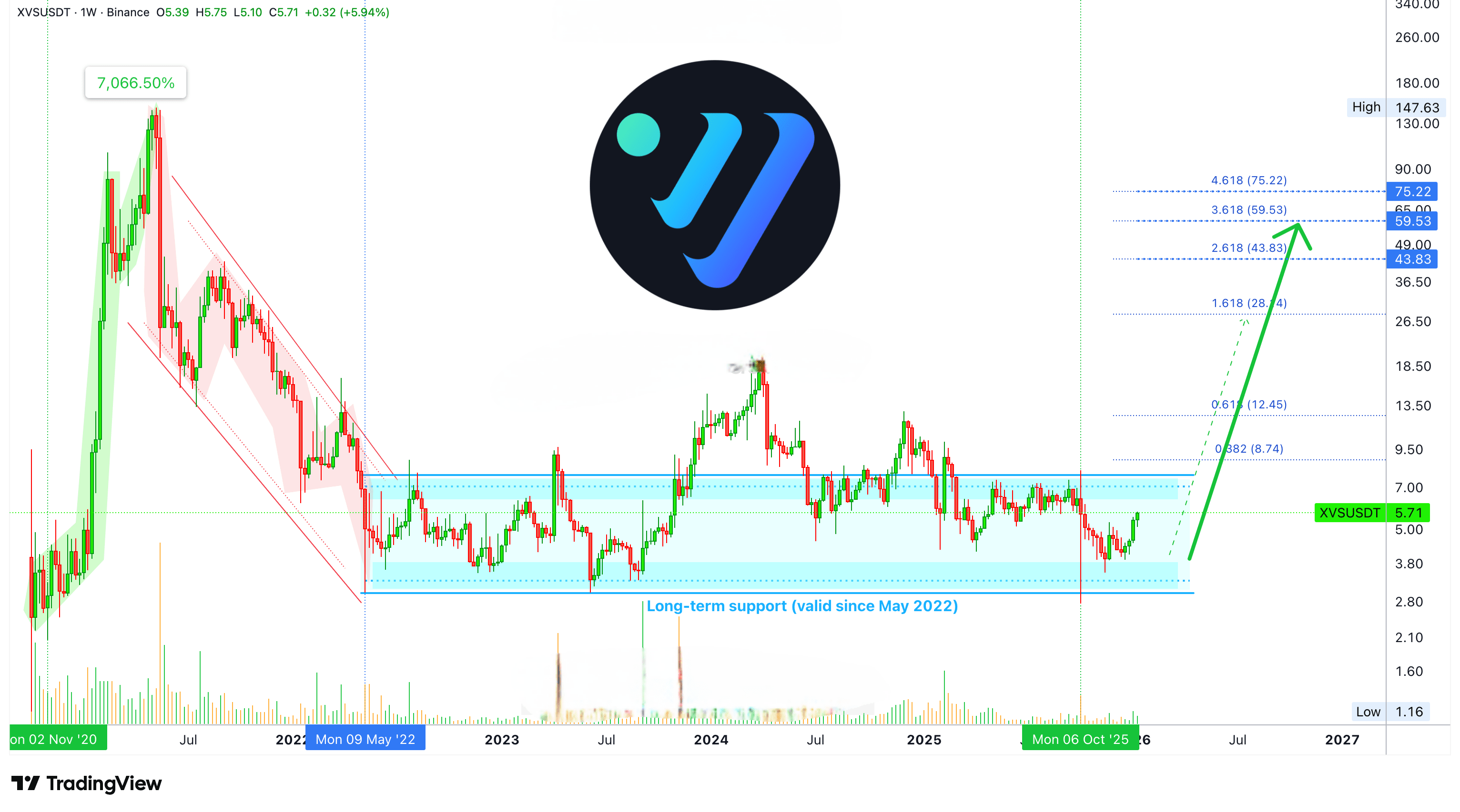 Il precedente mercato ribassista per Venus, XVSUSDT, è terminato nel maggio 2022. La zona di supporto stabilita con questo minimo è ancora attiva oggi. È stata testata con il flush di mercato di ottobre 2025 e resiste. Stiamo ora entrando in un nuovo ciclo rialzista. Venus ha già chiuso tre settimane consecutive in rialzo e di nuovo è completamente in rialzo.