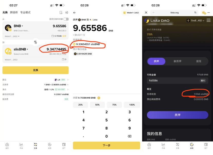 Hai visto? Anche se ci sono 9.65586 BNB, nello stesso momento, gli slisBNB ottenuti erano rispettivamente 9.34774495, 9.33654551, 9.3365. L'immagine 1 ha un intermediario che guadagna una differenza, ma alla fine dà di più🙉🙄, è davvero ridicolo.
