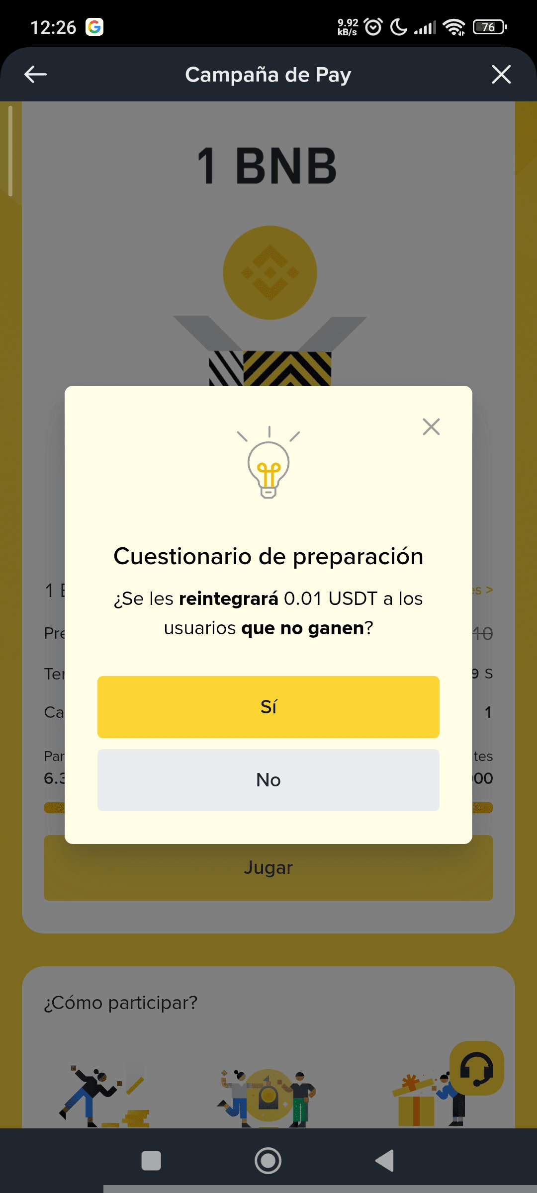 • Paso 2: Debes tener al menos 0.01 USDT en tu billetera (Spot o Fondos) Presiona "Jugar" te aparecera el siguiente mensaje