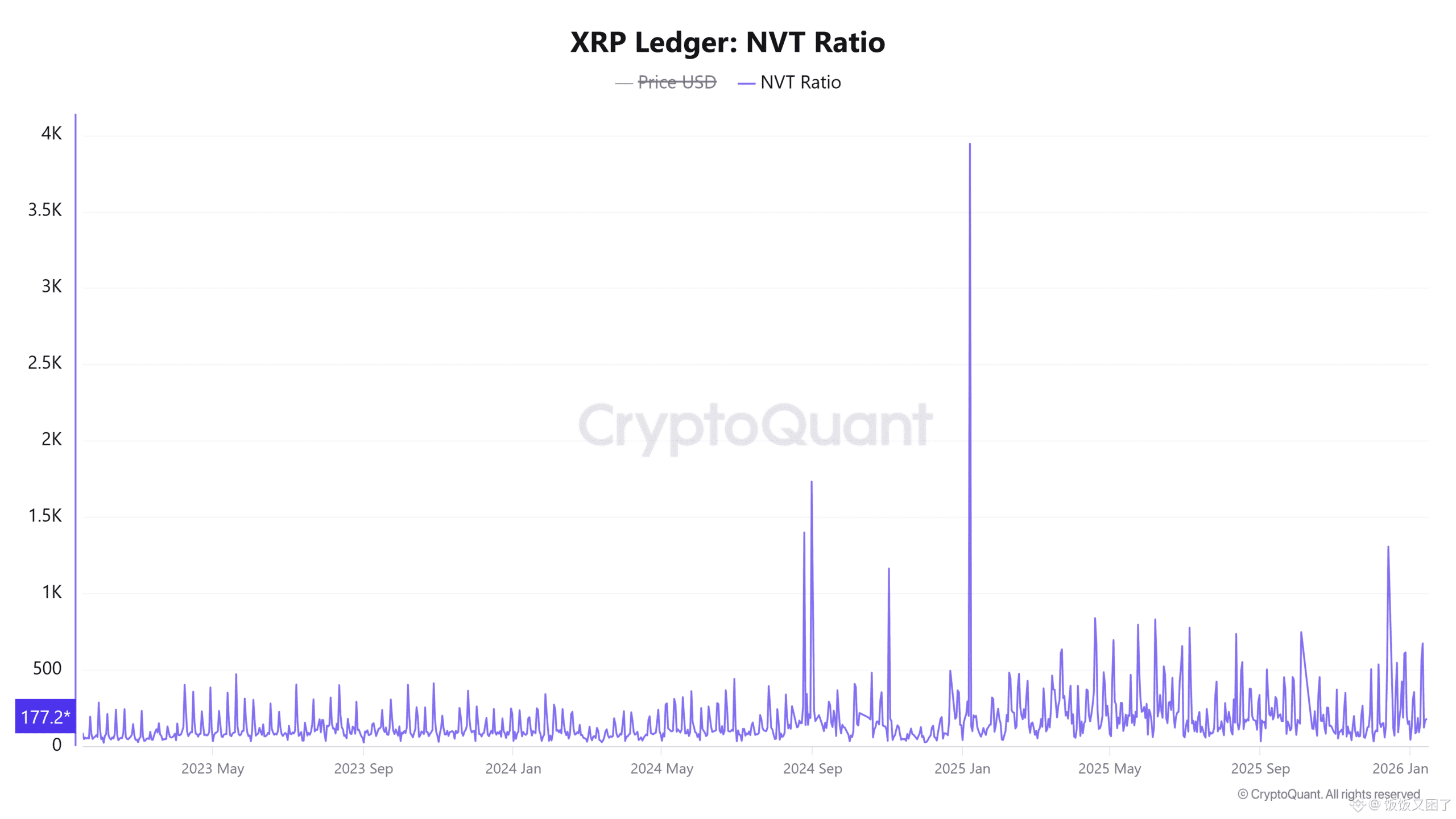 XRP的网络价值与交易量之比(NVT)上涨了4.46%,达到177.25。这表明市场价值增长速度超过链上交易活动,通常出现在价格整合阶段,而非突破阶段。换句话说,尽管ETF和资金流出显示市场在积累,但链上活动尚未加速,价格上涨可能会受到限制。投资者需要关注网络使用量的变化,只有链上参与度显著提升,价格才可能获得结构性突破。
