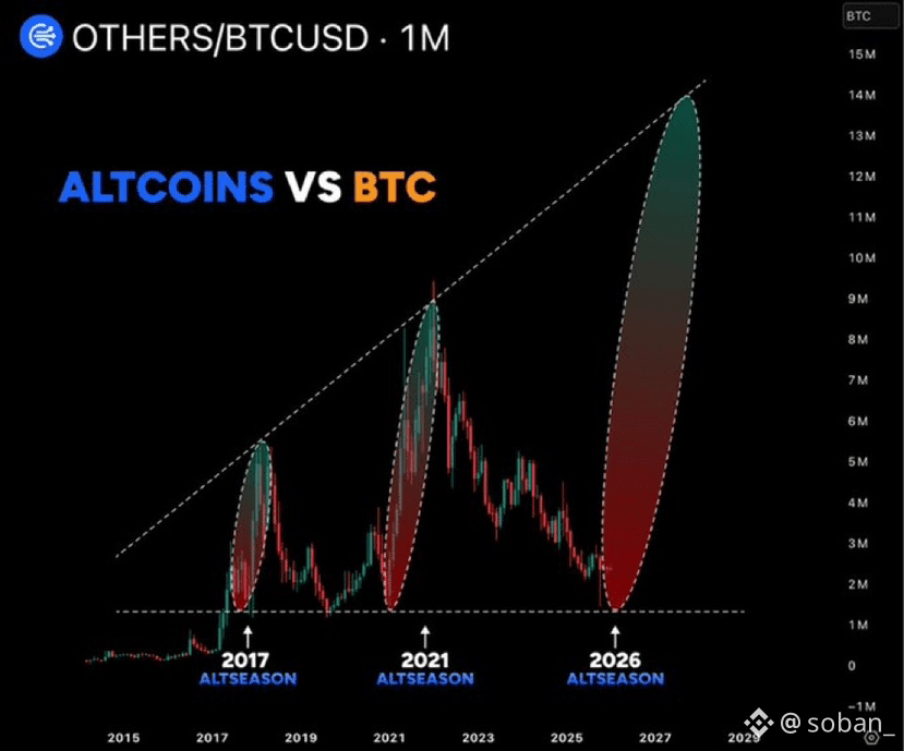 When you measure Altcoins vs Bitcoin (OTHERS/BTC) on the long-term timeframe, a powerful rhythm emerges—2017, 2021, and now… 2026. History doesn’t just rhyme here; it cycles.