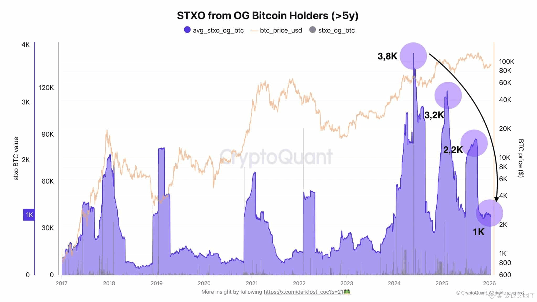 在 2024 年,老牌持有者曾借助机构资金和政策买盘积极出货,当时单周期的抛售峰值接近 3800 枚比特币。但进入当前阶段后,这一数字先降至 3200 枚,随后又进一步回落到 2200 枚附近。