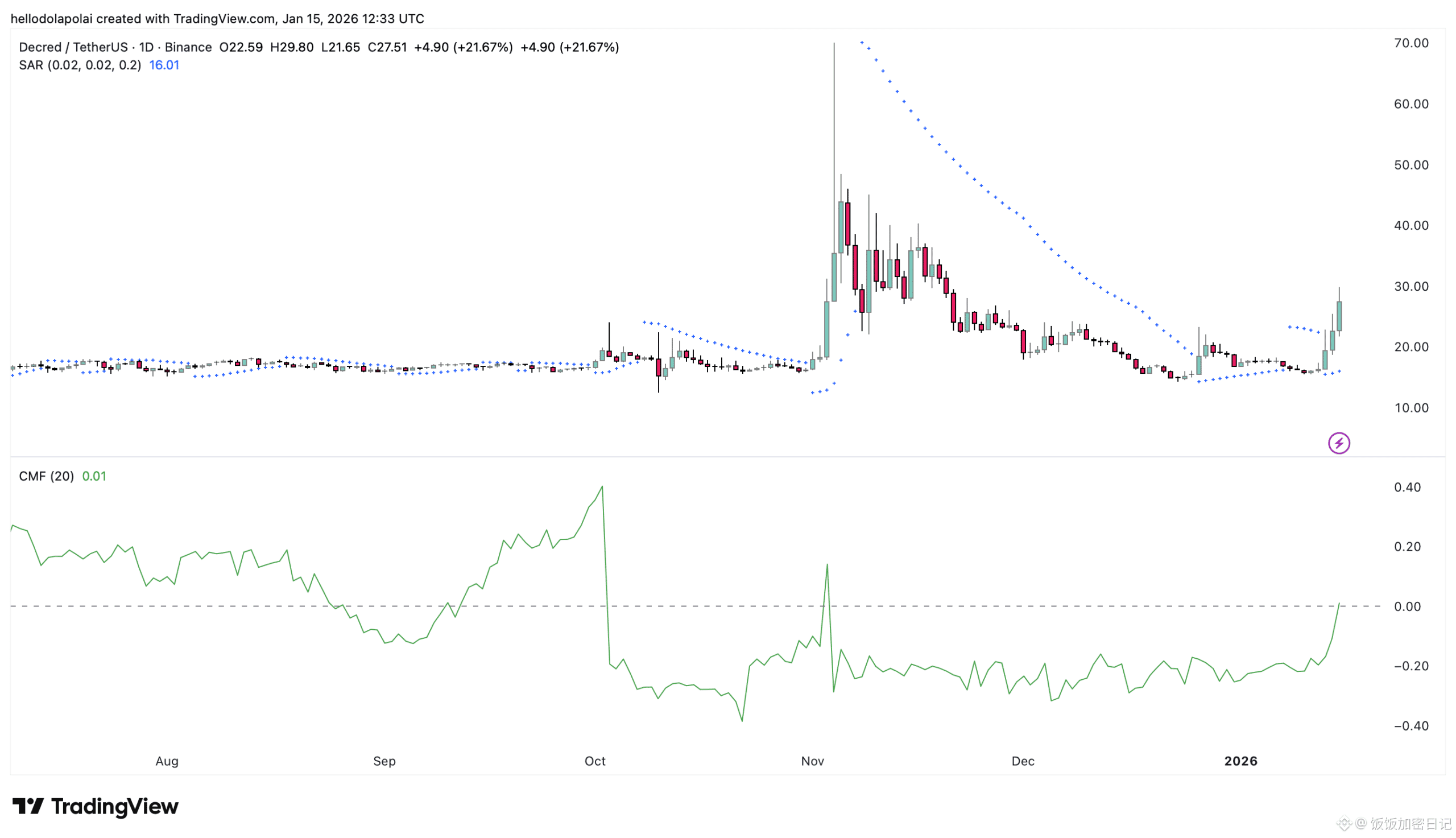从图表来看,DCR 当前的走势仍然偏强。抛物线转向指标(Parabolic SAR)已经运行在价格下方,这是典型的多头趋势信号,意味着上涨结构尚未被破坏。