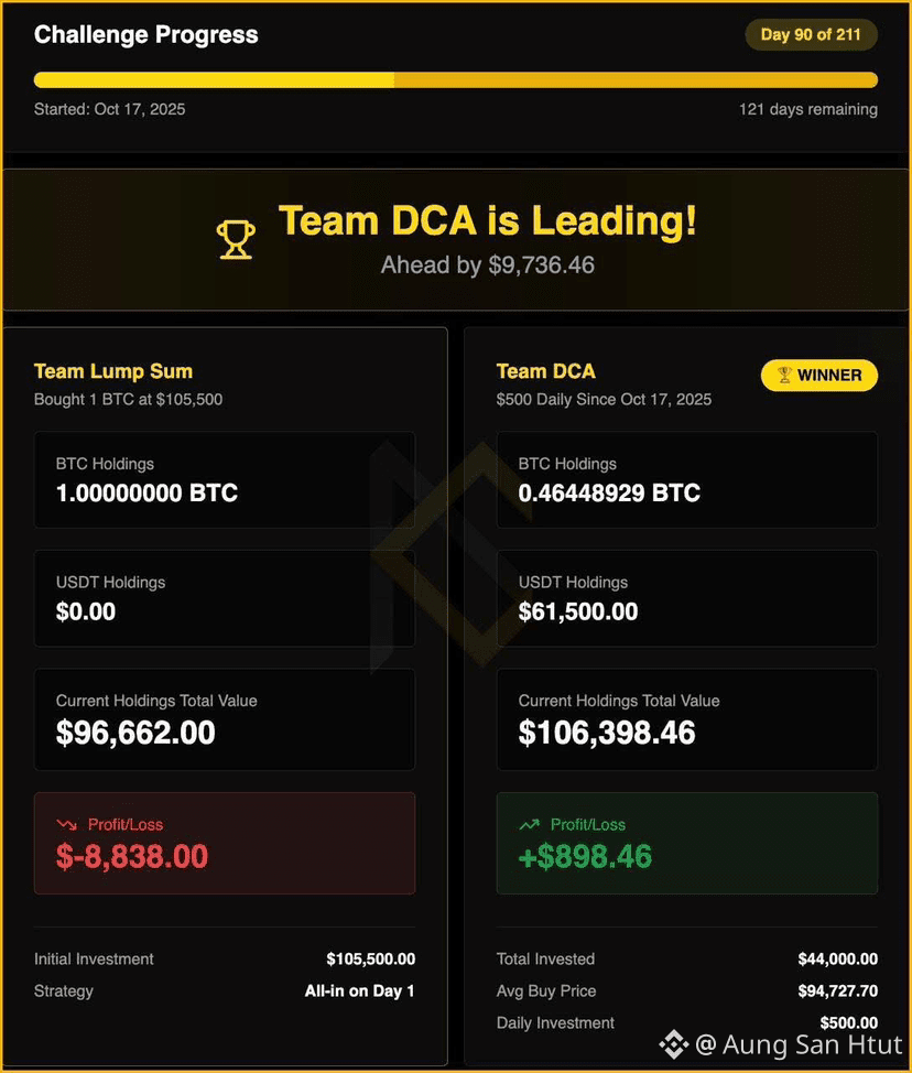 The 1 BTC bet comparing Lump Sum vs DCA has now reached 90 days since it began. Up to this point, the DCA Team has consistently remained ahead of the Lump Sum Team. The 1 BTC lump-sum purchase was made at a price of $105,000, and we will have to wait and see whether the price can rise above the purchase price and allow the Lump Sum strategy to overtake DCA.