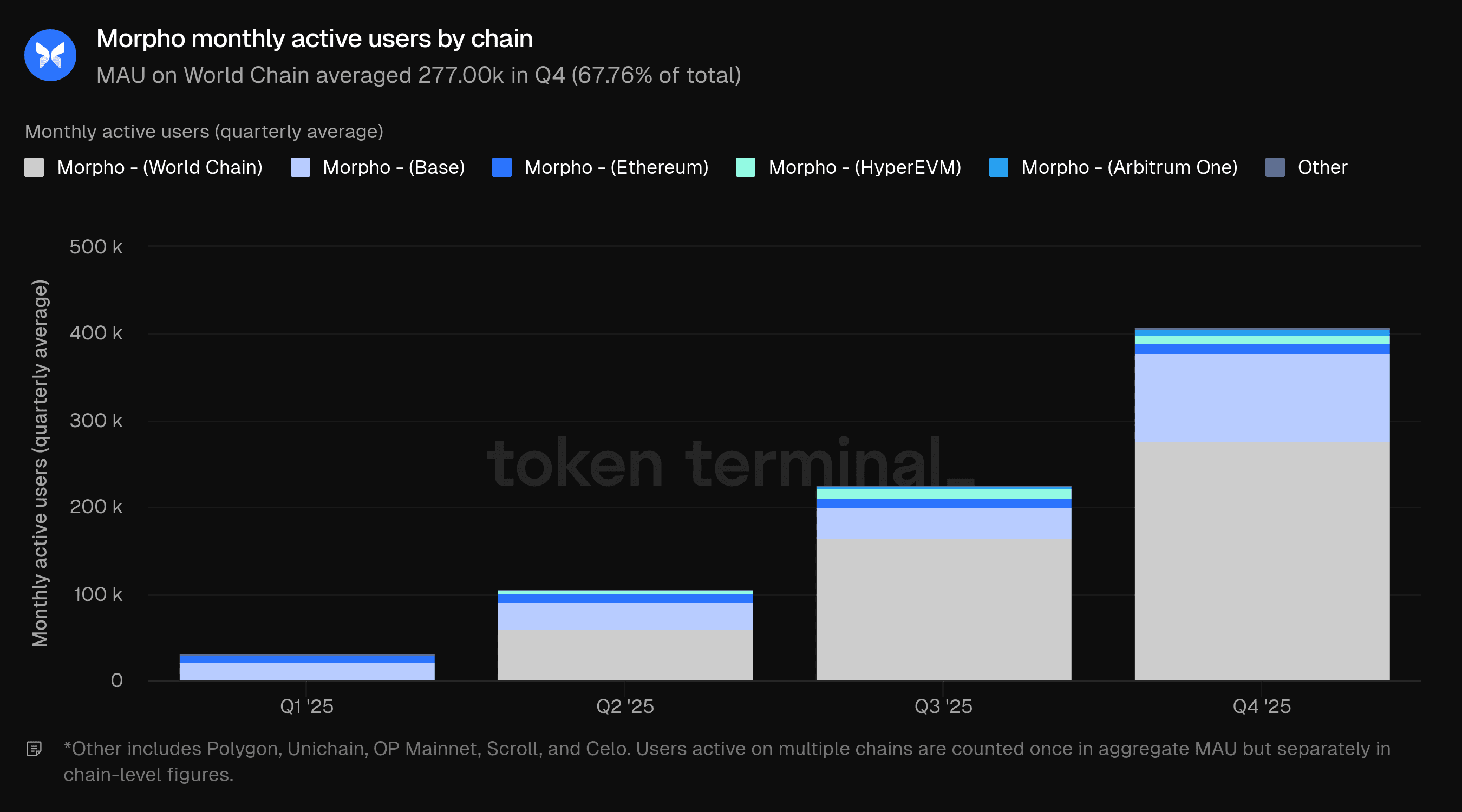 Gli utenti attivi mensili (MAU) misurano il numero di indirizzi di portafoglio unici che hanno interagito con Morpho in un periodo di 30 giorni. Il MAU del Q4 ha avuto una media di 403.50k, in aumento rispetto a 223.00k nel Q3, rappresentando un aumento dell'80.94% rispetto al trimestre precedente. World Chain ha rappresentato 277.00k utenti (67.76% del totale del Q4), seguito da Base a 102.20k (25.00%), Ethereum a 11.10k (2.72%), HyperEVM a 9.40k (2.30%) e Arbitrum One a 6.60k (1.61%). Altre catene hanno contribuito collettivamente con 2.50k (0.61%).* Base è cresciuta del 181.54% QoQ mentre Arbitrum One è cresciuta del 450.00% QoQ. World Chain è cresciuta del 68.90% QoQ.