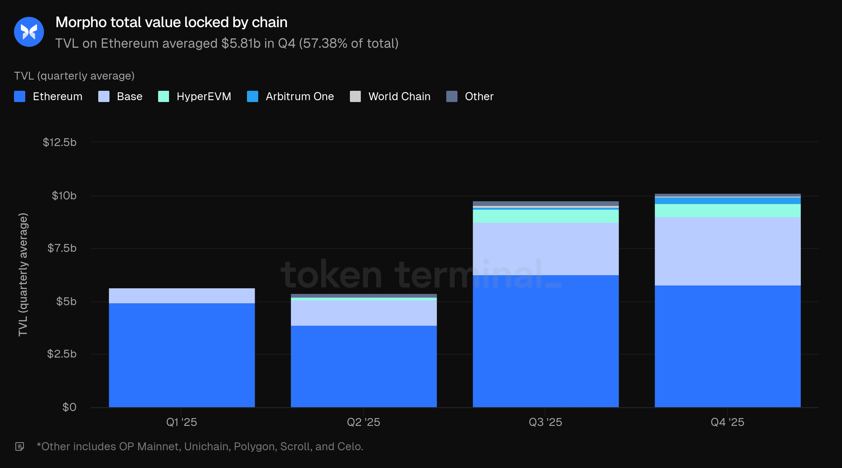 Il valore totale bloccato (TVL) misura il valore totale in USD delle garanzie depositate in Morpho e dei prestiti in essere. Il TVL del Q4 ha avuto una media di $10.12b, in aumento rispetto a $9.77b nel Q3, rappresentando un aumento del 3.56% rispetto al trimestre precedente. Ethereum ha rappresentato $5.81b (57.38% del totale del Q4), seguito da Base a $3.19b (31.53%), HyperEVM a $641.41m (6.34%), Arbitrum One a $296.67m (2.93%) e World Chain a $58.83m (0.58%). Altre catene hanno contribuito collettivamente con $126.01m (1.24%).* Base è cresciuta del 29.19% QoQ mentre Arbitrum One è cresciuta del 338.39% QoQ. Ethereum è diminuita del 7.47% QoQ.