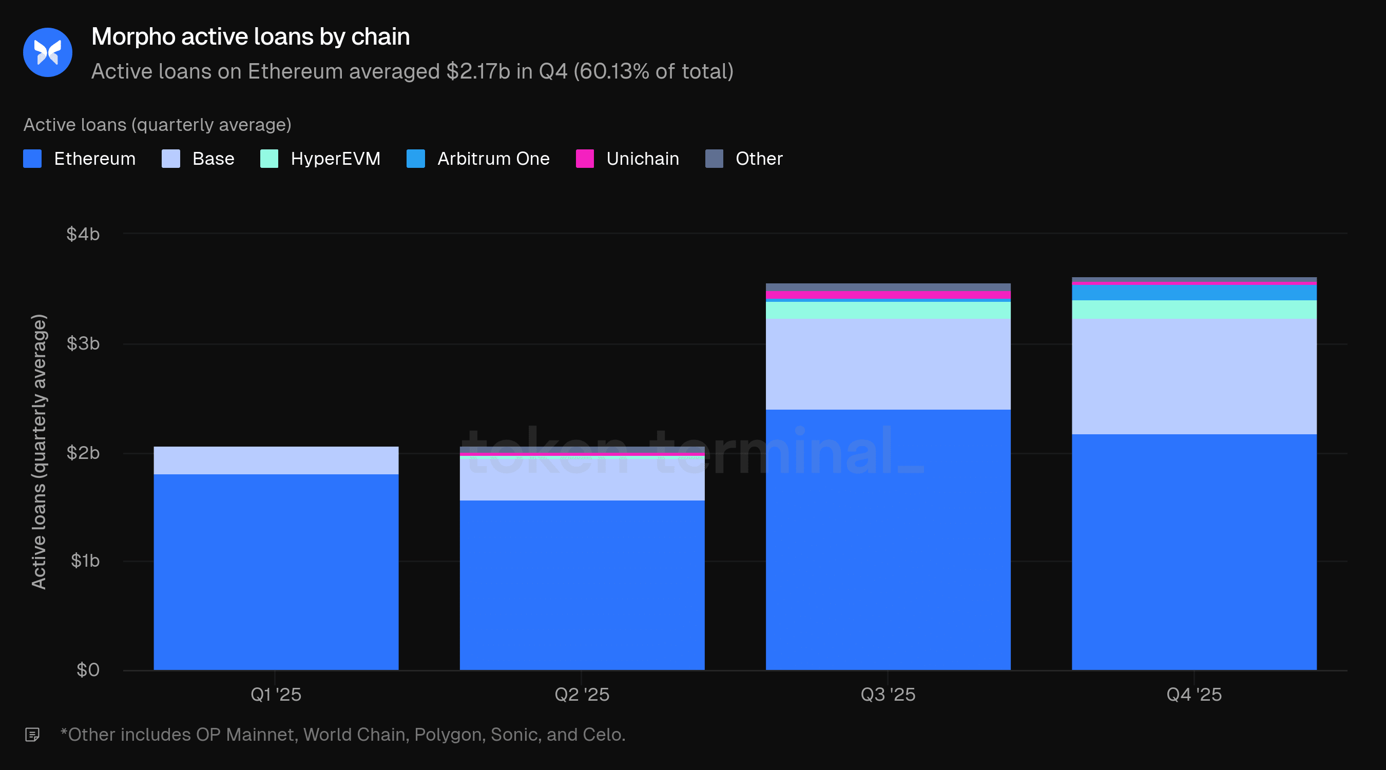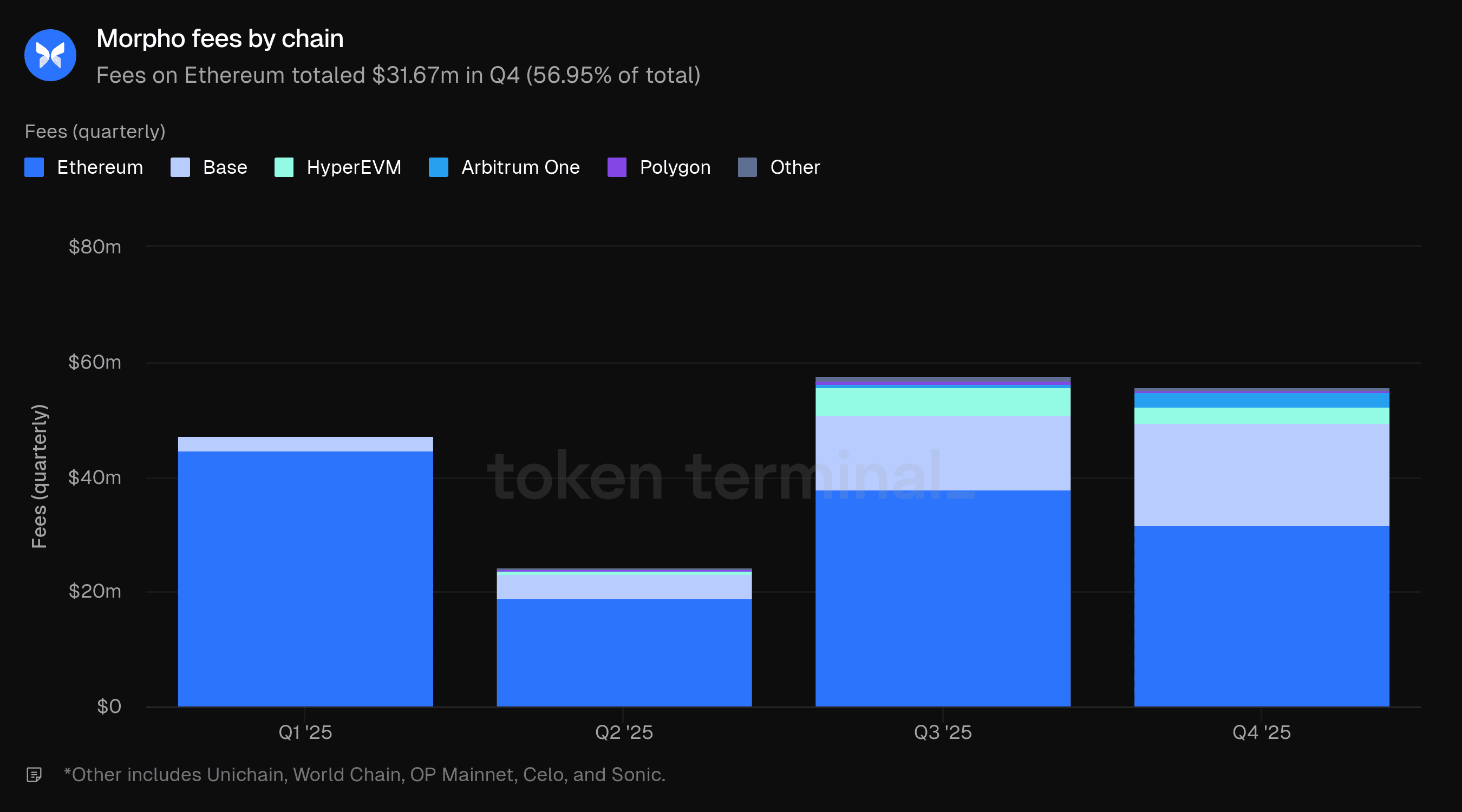 Nel Q4 2025, Morpho ha visto una crescita moderata nel TVL e nei prestiti attivi mentre le commissioni sono diminuite leggermente. Gli MAU sono quasi raddoppiati, guidati principalmente da World Chain e Base. Ethereum continua a guidare in TVL, prestiti attivi e commissioni, anche se la sua quota sta diminuendo man mano che le implementazioni multichain continuano a scalare.