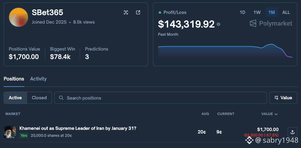 بقي الحساب المتبقي SBet365، الذي وضع رهاناً آخر قبل يومين، يتنبأ بأن المرشد الأعلى الإيراني آية الله علي خامنئي سيتم إزاحته بحلول 31 يناير، كما لاحظ Lookonchain.