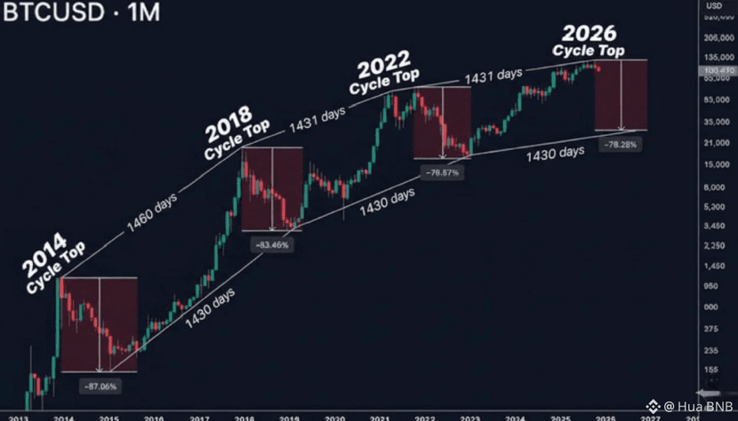 Se il ciclo di 4 anni di #Bitcoin continua a svolgersi come in passato, il 2026 potrebbe trasformarsi in un anno di pesante correzione 😱 — a meno che non entri nel mercato qualcosa di veramente rivoluzionario. Storicamente, $BTC non si muove a caso; segue un ritmo che si è ripetuto in ogni ciclo principale finora. Guardando ai dati, circa due anni dopo ogni halving, Bitcoin è entrato in una profonda tendenza al ribasso e ha formato un fondo a lungo termine: • 2014: -87% di calo (da $1,240 a $166)• 2018: -84% di calo (da $19,804 a $3,124)• 2022: -77% di calo (da $69,000 a $15,473)Se la storia rimane coerente in questo ciclo: • $BTC toppato vicino a $126,000• Una correzione tipica del 70–75% collocherebbe il potenziale minimo intorno a $30,000–$37,000Dal mio punto di vista personale, questo ciclo sembra vicino alle sue fasi finali. Il ciclo di Bitcoin di 4 anni è rimasto sorprendentemente accurato attraverso molteplici epoche di mercato, e finora, nulla ha veramente rotto quella struttura.La grande domanda ora è: Pensi che il ciclo di Bitcoin di 4 anni si ripeterà di nuovo nel 2026 — oppure questa volta è diverso?Condividi i tuoi pensieri qui sotto 👇$BTC BTC #MarketRebound #BTCVSGOLD #MarketRebound #BTC100kNext ? #StrategyBTCPurchase