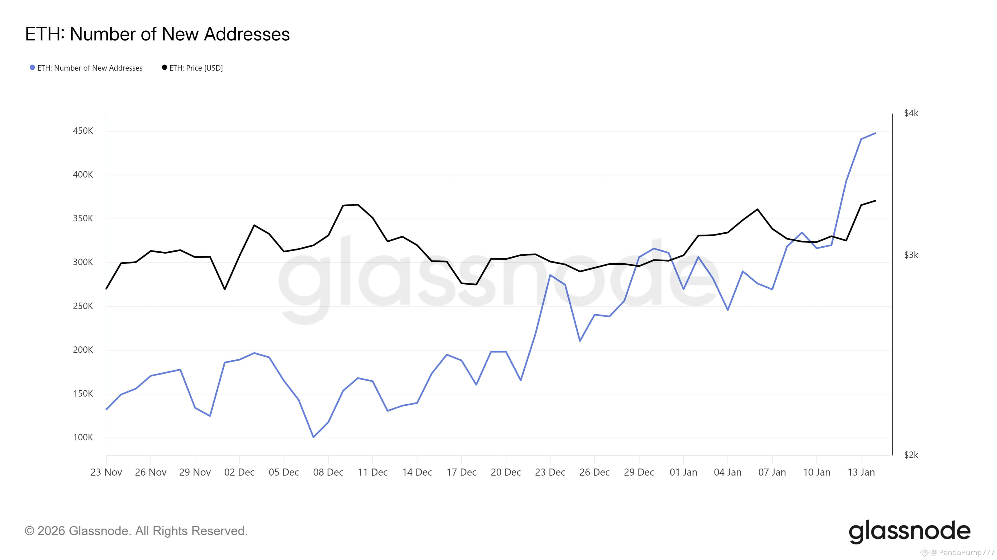 1. Рекордный приток новых пользователей: За последние 24 часа в сети Ethereum было создано 447 тысяч новых активных адресов. Это не только максимум за семь лет, но и значительный скачок по сравнению с показателями прошлой недели (~300 тыс. в день). Такой рост указывает на формирование органического спроса и расширение экосистемы.