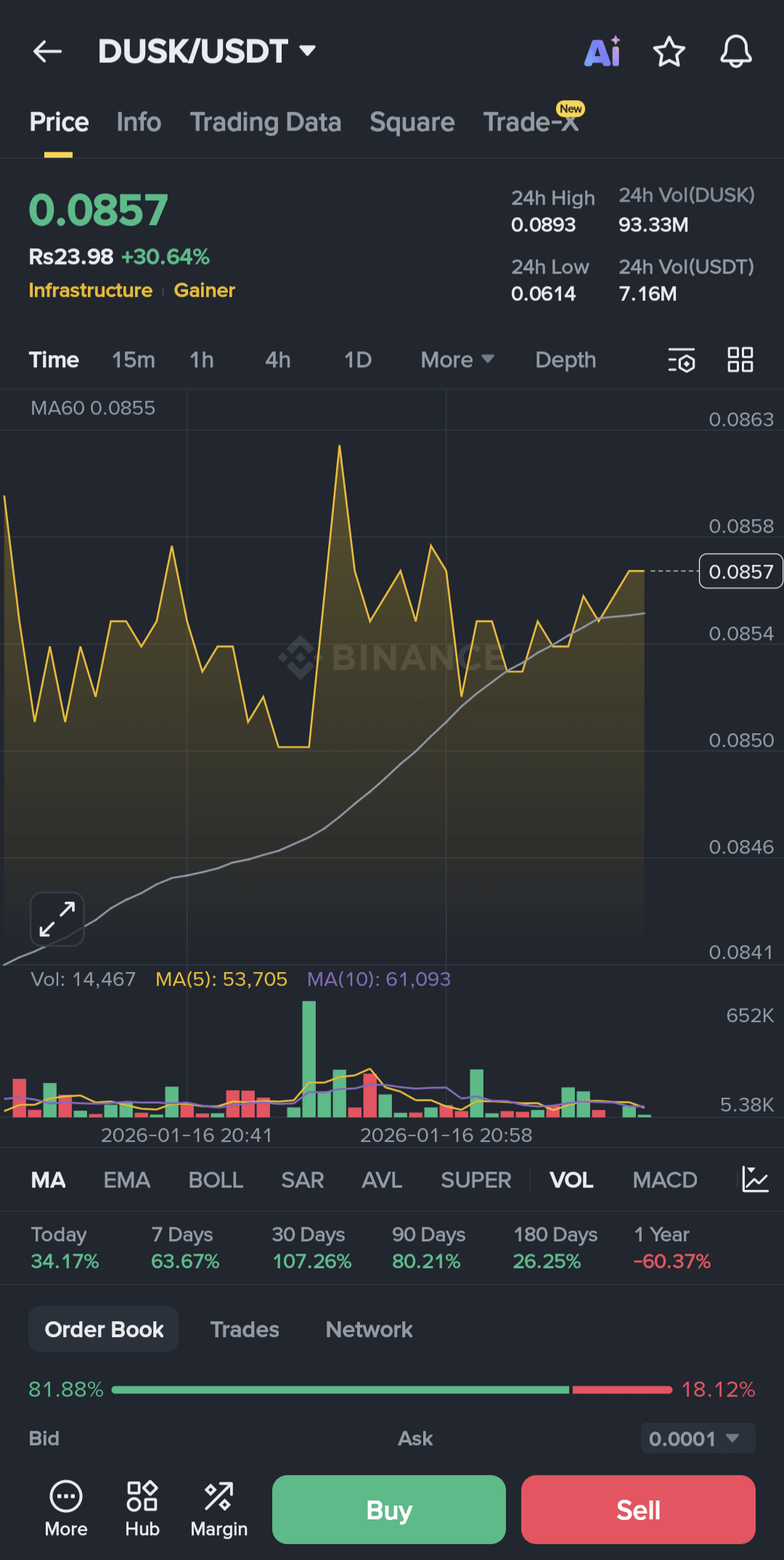 $DUSK $USDT appena pompato a $0.08475, in aumento di un enorme +30.12% in 24h! 🚀