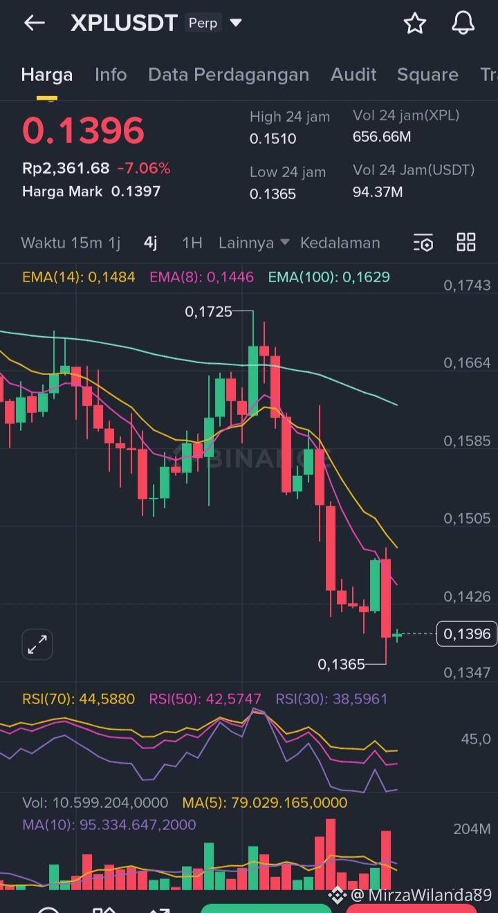 Secara struktur, XPL saat ini memang masih berada di bawah beberapa EMA penting, yang menandakan tren jangka pendek belum sepenuhnya pulih. Namun jika diperhatikan lebih dalam, tekanan jual mulai melambat dan volatilitas mulai menyempit. Kondisi seperti ini sering kali menjadi fase transisi, di mana seller mulai kehabisan tenaga dan buyer mulai masuk secara bertahap.
