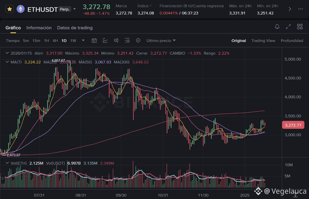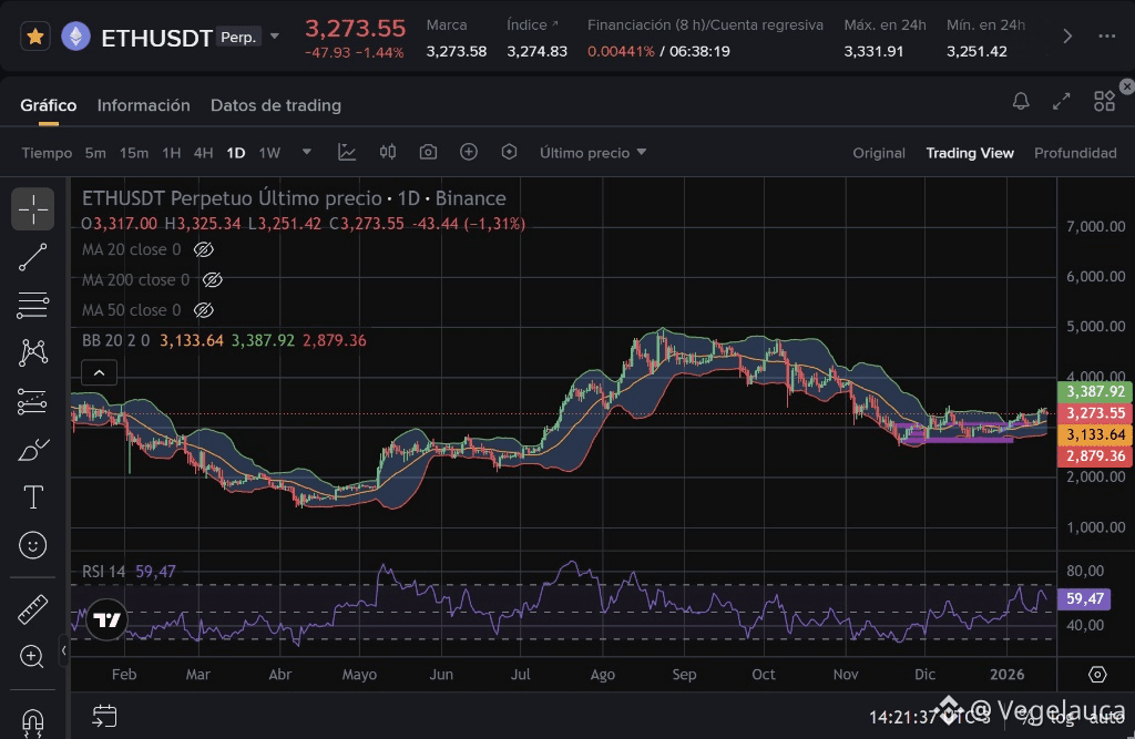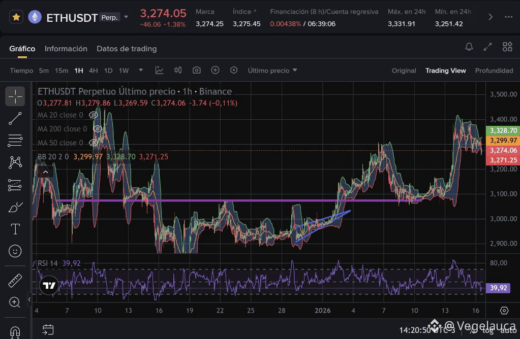 Actualmente, el mercado ha pasado de una fase de expansión (euforia) a una de compresión y corrección. Las velas diarias muestran que, aunque los toros intentaron tomar el control, la oferta en la parte alta fue superior, devolviendo al precio a una zona de negociación media (~3.270 USDT). No es un colapso, es el mercado "respirando" tras el esfuerzo.