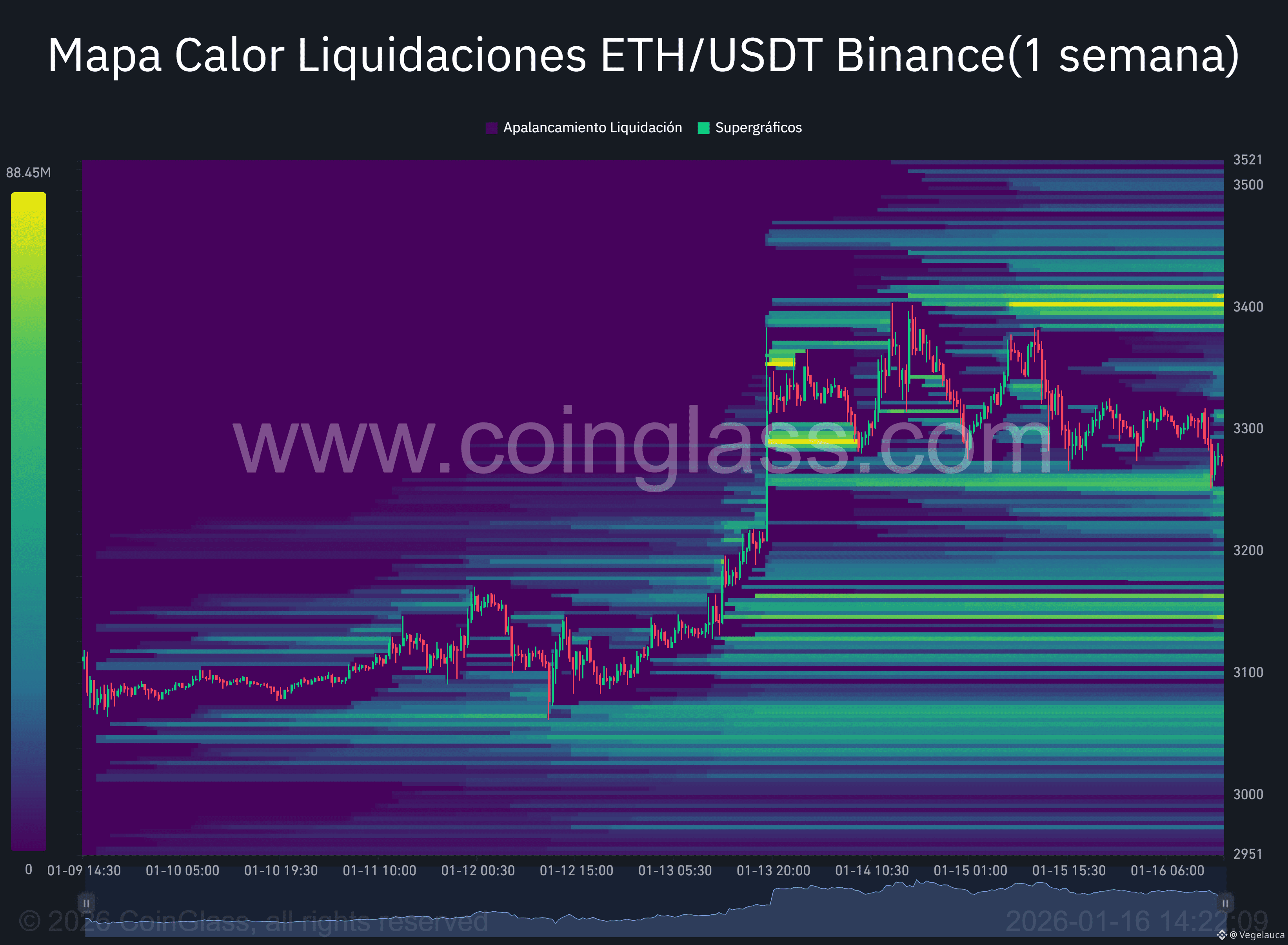 El precio actuó como un imán hacia las zonas de alta liquidez (líneas amarillas brillantes en el mapa) situadas sobre los 3.350 - 3.400 USDT. Una vez que esa liquidez fue tomada (barrido de stops de shorts y entradas por FOMO), el "combustible" se acabó y el precio retrocedió buscando contrapartida.