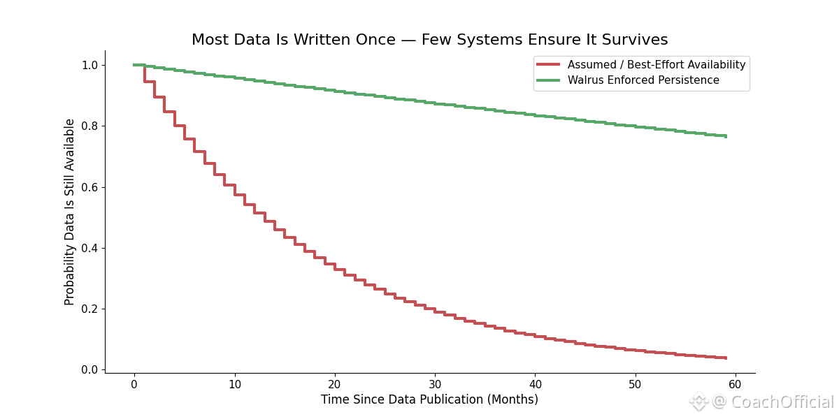 Early blockchains avoided this problem by storing everything onchain. Availability was guaranteed, but costs scaled poorly. As usage expanded, the industry externalized data to reduce overhead. In many cases, availability became an implicit promise rather than an enforceable property. Data existed as long as it was convenient for someone to keep it available. Walrus challenges that model by treating availability as a responsibility that must be maintained over time.