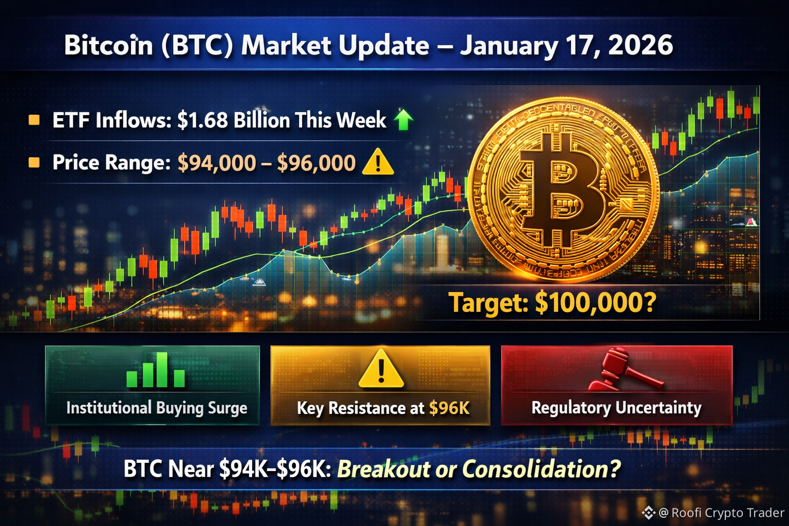 #Despite this buying pressure, #Bitcoin ’s price has been range-bound near the $94,000–$96,000 zone with notable resistance preventing a clear breakout toward $100,000. Many analysts see this as a critical “make-or-break” zone — if #BTC can sustain above it, broader market momentum could strengthen; failure could prolong sideways trading.