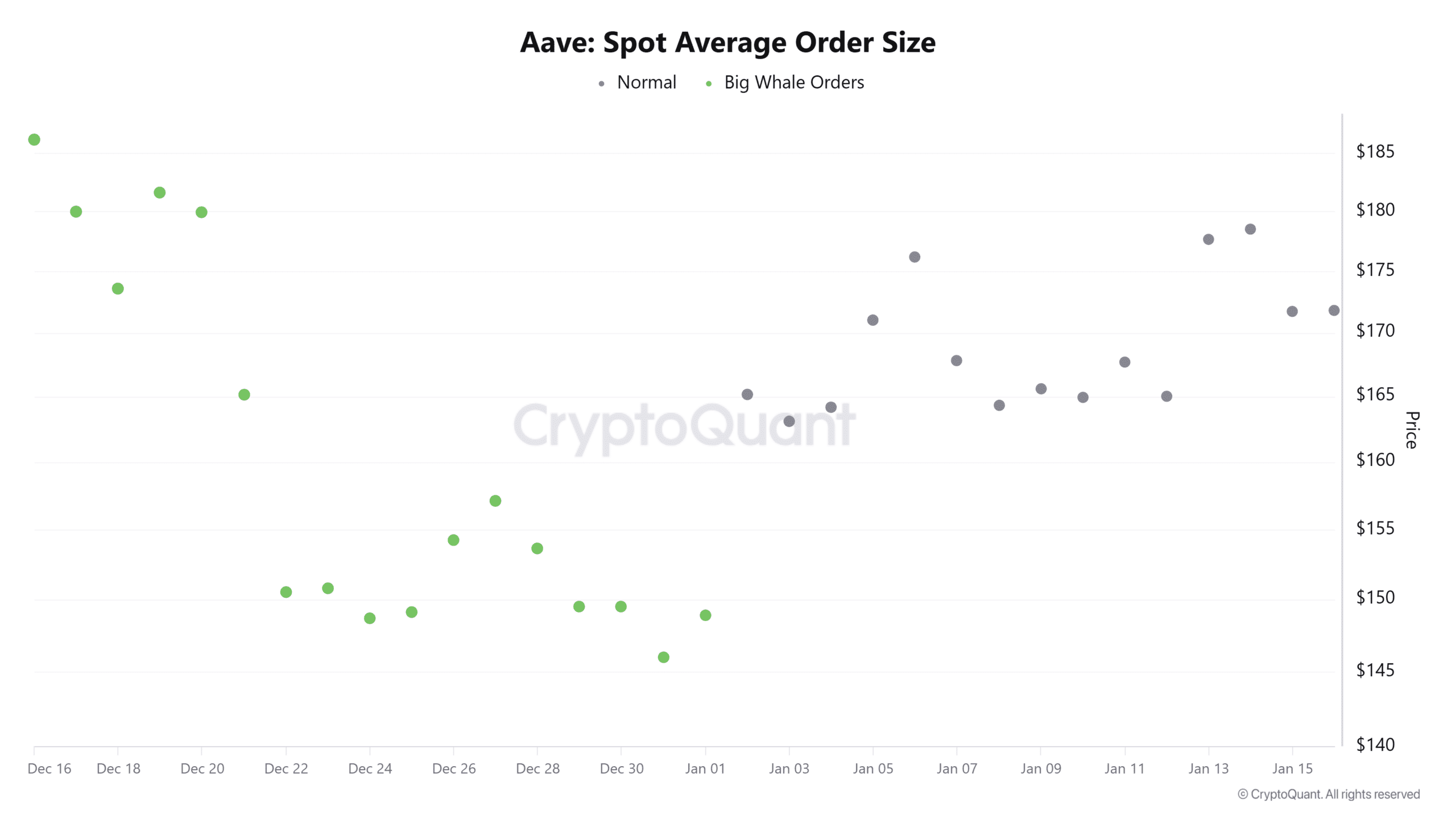 Dal inizio del 2026, i movimenti delle balene di AAVE sono stati piuttosto silenziosi. Secondo i dati sulle dimensioni medie degli ordini spot di CryptoQuant, dal 1 gennaio ci sono stati quasi nessun ordine di balena di grandi dimensioni, riflettendo indirettamente che istituzioni e grandi capitali hanno scelto di attendere o addirittura di uscire temporaneamente, con un sentimento di mercato complessivamente debole.