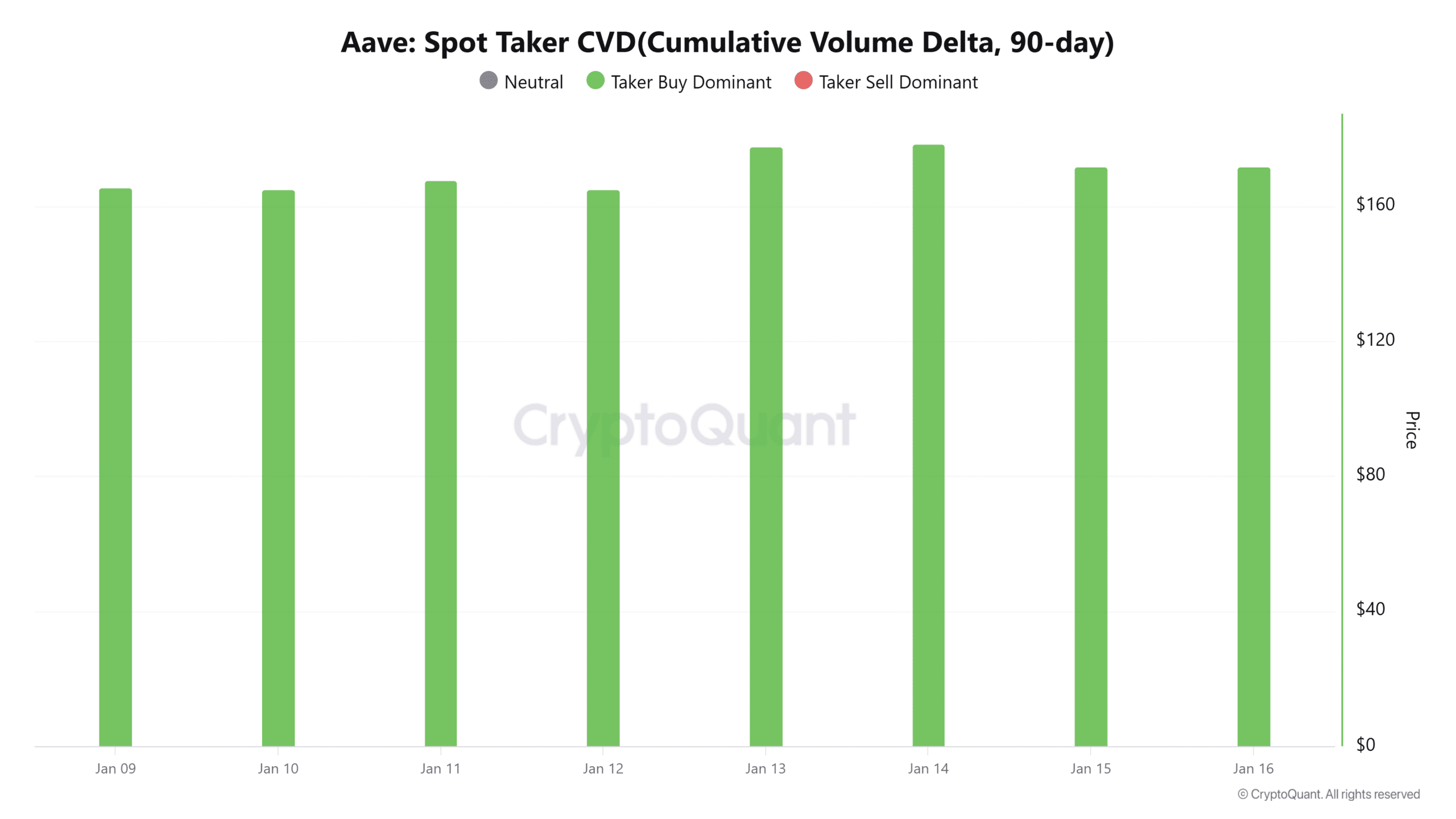 Nel frattempo, l'indicatore CVD spot di AAVE è aumentato costantemente nell'ultima settimana, segnalando che gli acquisti attivi stanno dominando la struttura delle transazioni. Questo aumento spinto dagli acquisti è solitamente più sostenibile rispetto a un rimbalzo passivo, portando l'attuale situazione di mercato a uno stadio degno di attenzione.