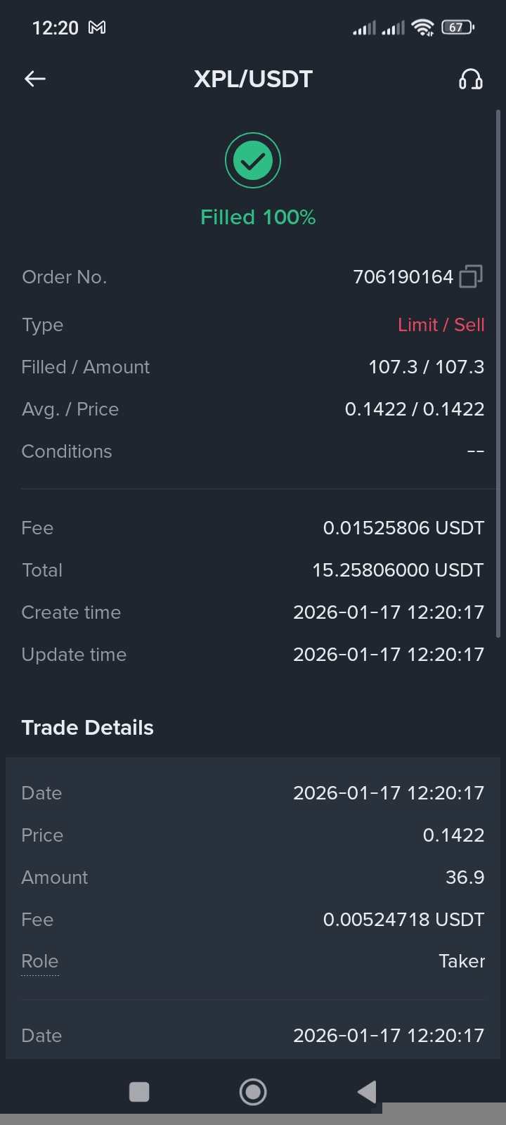 Nel mio ultimo scambio, ho inserito un ordine di vendita limitato per 107.3 XPL, che è stato riempito al 100% a un prezzo medio di 0.1422 USDT. Il valore totale dello scambio è stato di 15.25806 USDT, con una commissione di trading di 0.01525806 USDT. L'ordine è stato eseguito senza intoppi, e parte dello scambio è stato riempito come taker, mostrando una sana attività di mercato e corrispondenza degli ordini.