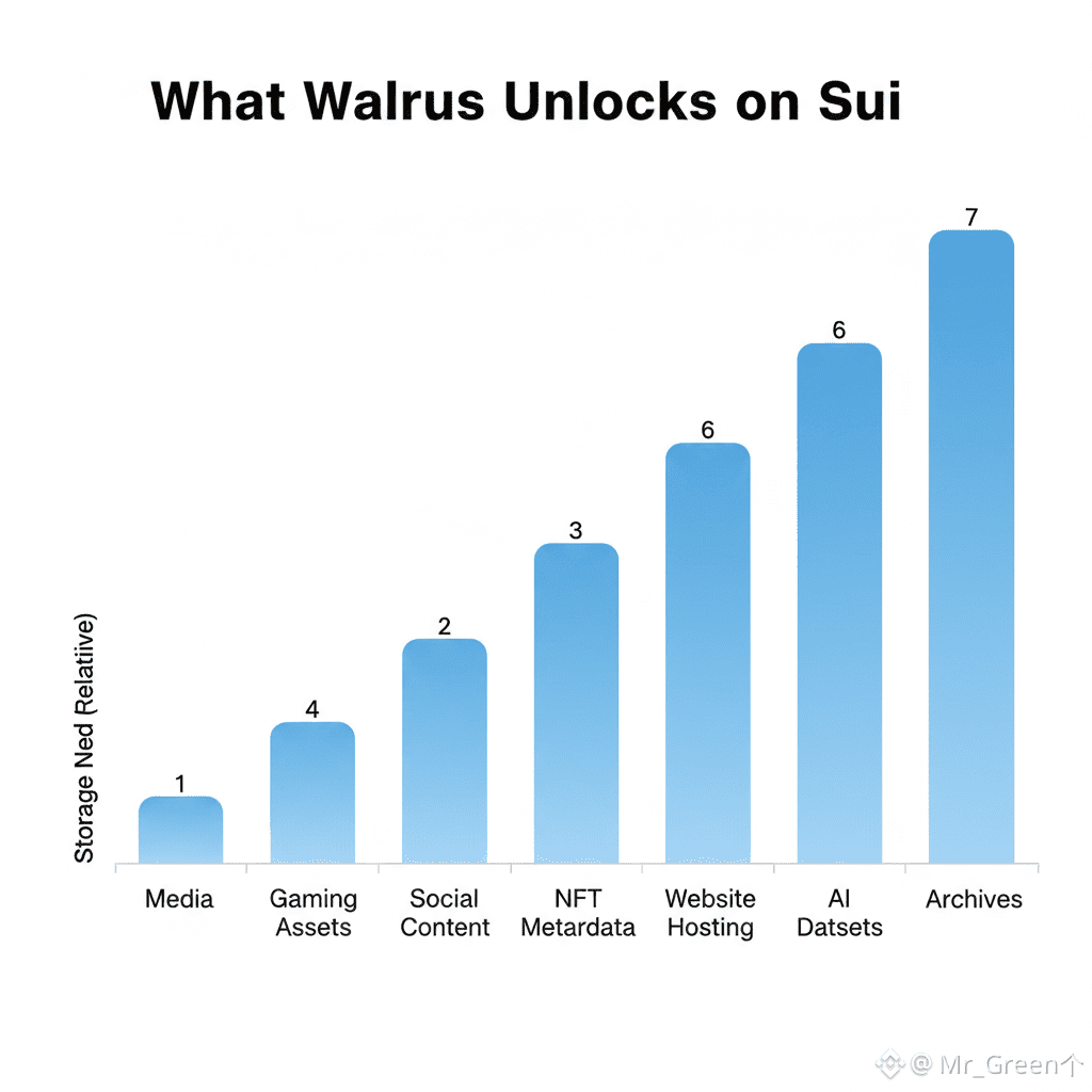 And that is why Walrus isn’t just “another protocol” in the Sui ecosystem. It’s a permissionless upgrade to what Sui can represent. Without big, reliable data, a high-performance chain mainly excels at moving small pieces of value and state around. With a blob layer next to it, Sui can host products that look like real internet applications: media platforms, games, social networks, data markets, publishing tools, archives, and experiences that feel complete rather than symbolic. Over time, that completeness compounds. More complete apps attract more users. More users justify more infrastructure. More infrastructure makes the next wave of apps easier to build.