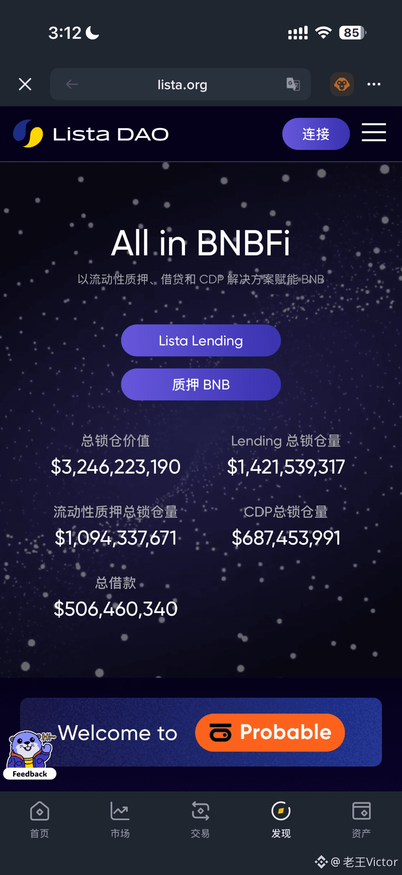 1. 打开 币安钱包进入发现页面的DApp,找到lista.DAO,连接钱包。从 Binance Wallet DApp 发现页搜索 Lista DAO(热门榜常驻)