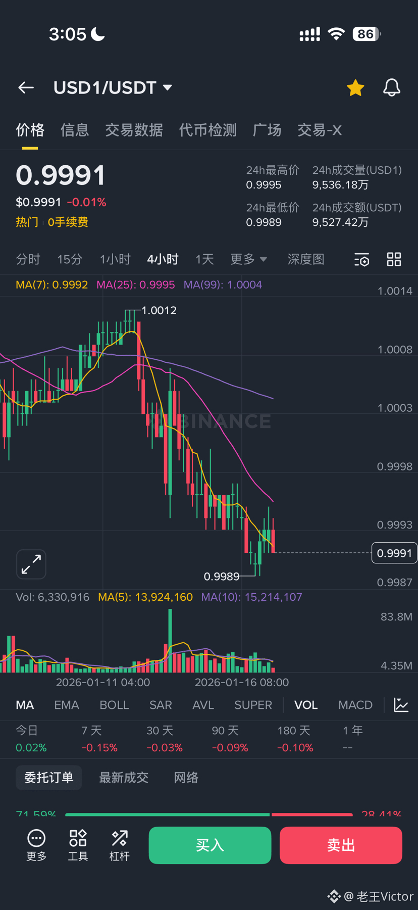 活动结束还有十天就都开始抢跑砸盘$USD1 了,我的8个5万U账户都没动,最近 USD1/USDT 价格轻微跌了,现在报价 ≈0.9991(24h 最低到 0.99889),从高点 1.0020下来,已经有 ≈0.1%-0.2% 的脱锚磨损。如果你手里直接持有 USD1 做理财,短期波动 + 潜在继续脱锚的风险会吃掉一部分收益,尤其是大额持有时更明显,不过不慌,可能还会再跌不过我觉得后续都会涨回来的。
