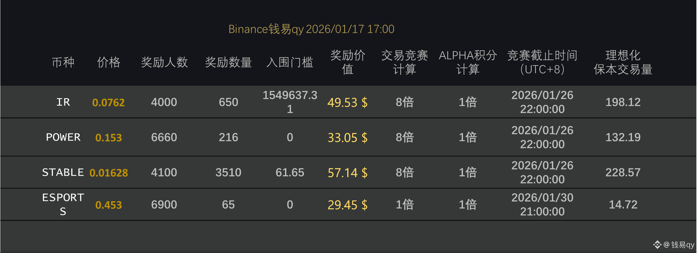 目前这几个都是 1 倍积分币,目前交易量活跃的有 IRSTABLE,IR 的话估计要反撸了,4 倍消失了这个币门槛还在不断增加。