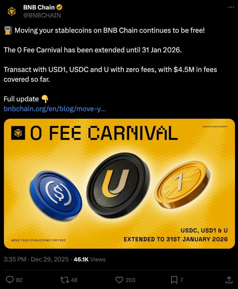 In una mossa per catturare il mercato dei pagamenti globali, BNB Chain ha introdotto il "Carnival senza commissioni" per i trasferimenti di USD Coin (USDC) e World Liberty Financial USD (USD1). Sottoscrivendo i costi del gas per le transazioni di stablecoin, la rete si è effettivamente trasformata in un sistema di pagamento globale gratuito e ad alta velocità.