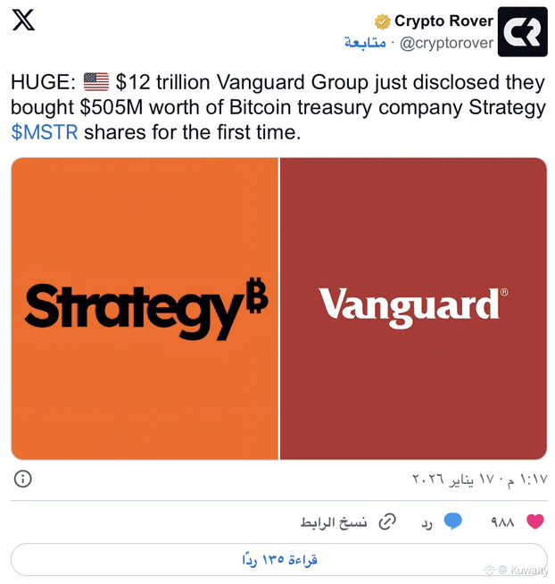 تكتسب هذه الخطوة أهمية خاصة لأن Strategy تعمل كشركة خزانة $BTC . تحتفظ الشركة باحتياطيات كبيرة من بيتكوين وتربط ميزانيتها العمومية مباشرة بأداء العملة. قرار فانغارد يشير إلى تحول ملحوظ في مستوى ارتياح المؤسسات تجاه التعرض لبيتكوين.
