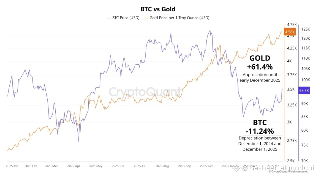 بينما انخفض سعر #البيتكوين إلى ما دون 100 ألف دولار، ارتفع سعر الذهب بنسبة 61%، مسجلاً أكبر قفزة سنوية له منذ أواخر سبعينيات القرن الماضي. أما البيتكوين، فقد انخفض بنحو 11% خلال الفترة نفسها.