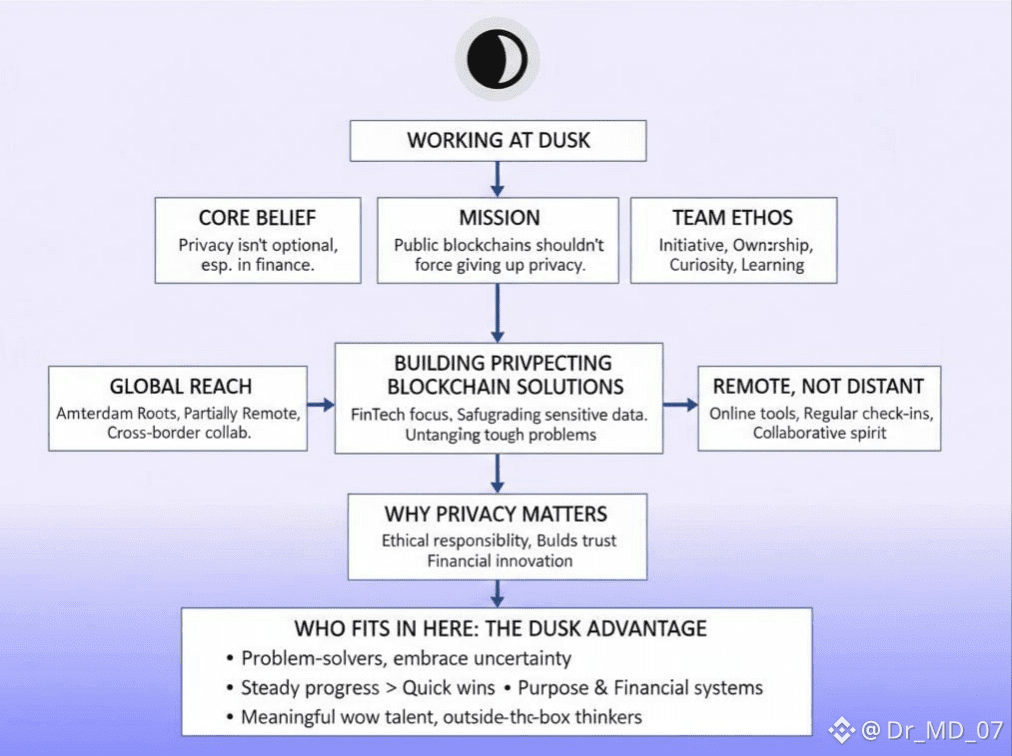 Dusk lives and breathes FinTech. The team’s whole mission is simple but gutsy: public blockchains shouldn’t force people to give up their privacy. That one idea shows up everywhere every product, every meeting, every technical choice. The team doesn’t shy away from tough challenges. Making strict privacy work on public blockchains is hard, honestly. It takes deep thought, patience, and the guts to question the way things are done. Sure, it’s demanding, but for people who care about building something meaningful, it’s also seriously rewarding.