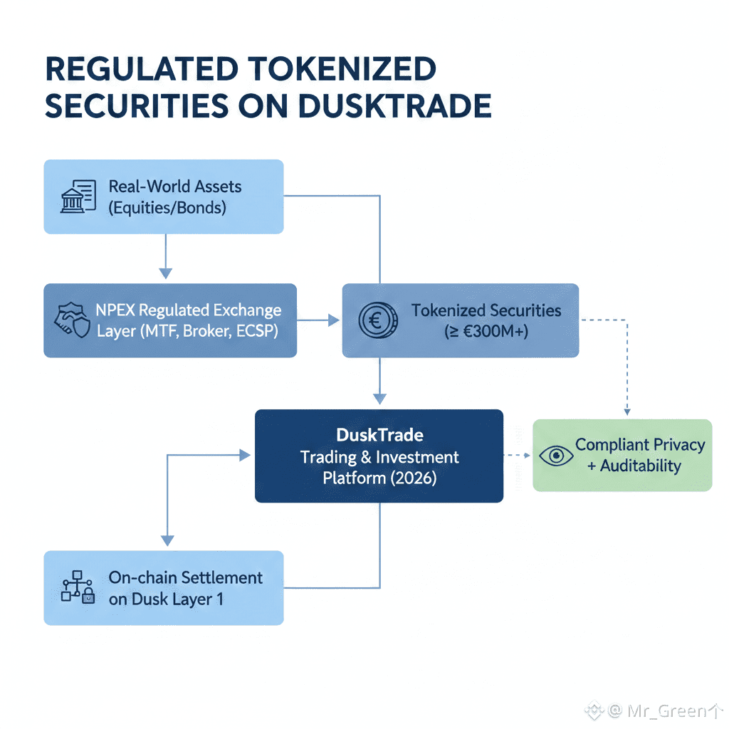 DuskTrade is set to go live in 2026, and it’s being presented as Dusk’s first major use case: a compliant trading and investment platform, working with NPEX, a regulated market from the Netherlands. The headline detail isn’t the mere fact of “tokenized assets”; it’s how they fit into a framework. NPEX has MTF, Broker and ECSP licenses, and aims to onboard €300M+ tokenized securities on-chain. That’s not a demo. That’s not a vibe. That is a serious effort to make blockchain into market infrastructure that real institutions can use.