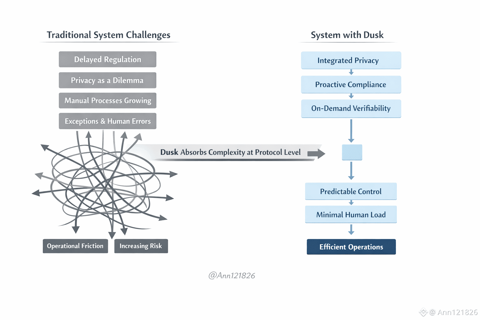 Dusk adopta un enfoque distinto. En lugar de exigir vigilancia constante, el protocolo absorbe la complejidad del control, permitiendo verificabilidad bajo demanda. Esto significa que la privacidad y el cumplimiento son propiedades intrínsecas del sistema, no tareas adicionales que consumen atención. Los equipos dejan de depender de supervisión manual, reduciendo errores, fricción y riesgos operativos. A medida que aumenta el uso del sistema, la operación se mantiene predecible y los costos no escalan de forma lineal.