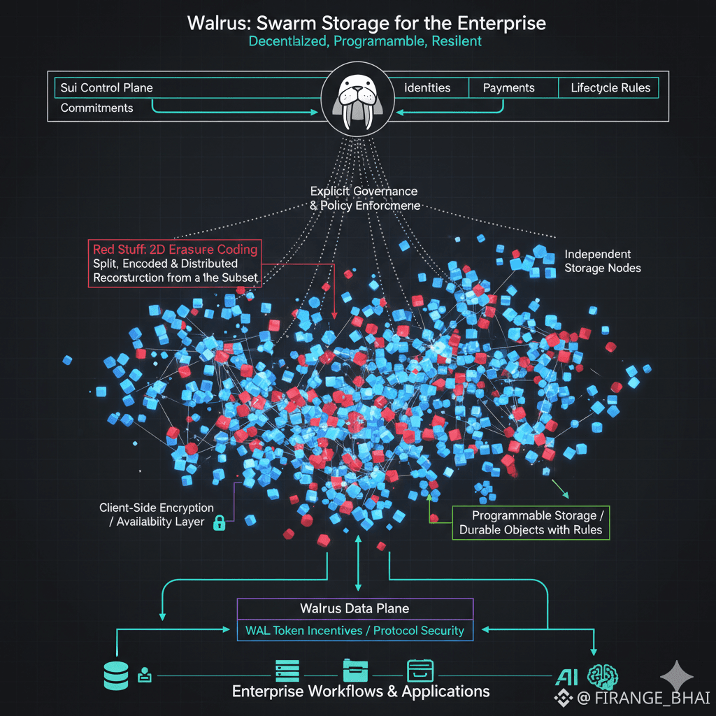 Enterprise storage has spent two decades perfecting a comforting story: put data in a small number of trusted places, wrap those places in identity controls and audits, and let the business move fast inside a predictable perimeter. That story is fraying in the moments that now define modern risk—cross-border teams working under conflicting regulations, software supply chains that pull in dozens of vendors, and AI pipelines that move terabytes of unstructured files through more tools than a security team can realistically map. Walrus is interesting because it doesn’t try to defend the castle harder. It changes the geometry of where data “lives,” turning large files into something closer to a swarm: broken apart, distributed, recoverable by math, and governed by explicit rules rather than silent vendor assumptions.