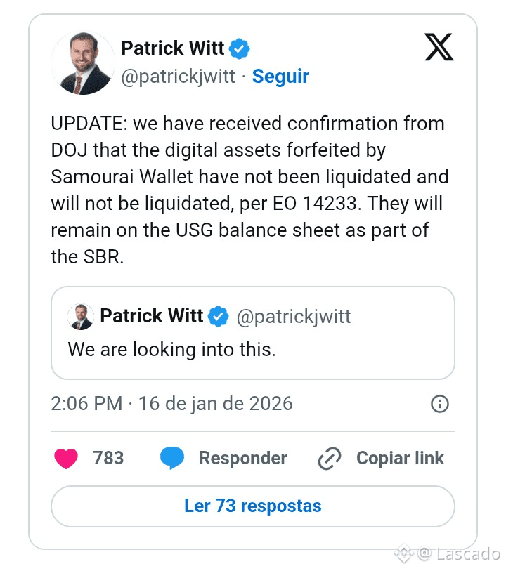 Só que, na sexta, Patrick Witt, que é diretor do Conselho de Ativos Digitais do Trump, contou que o Departamento de Justiça garantiu pra ele que esses Bitcoins não foram e nem vão ser vendidos.