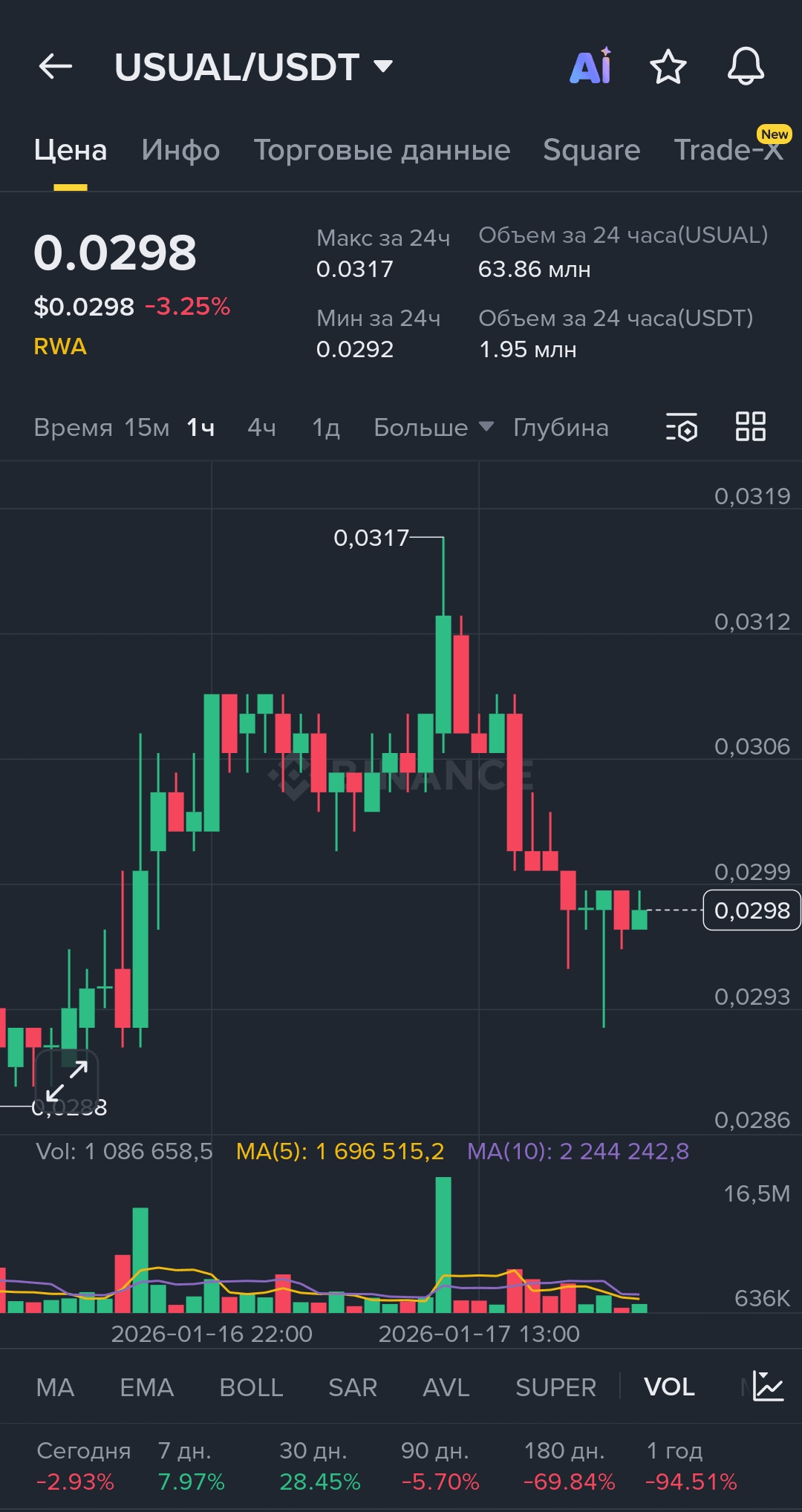 $USUAL scambia intorno a ~0.028-0.0301💲per moneta USUAL/USDT, significativamente al di sotto del massimo storico e con alta volatilità.