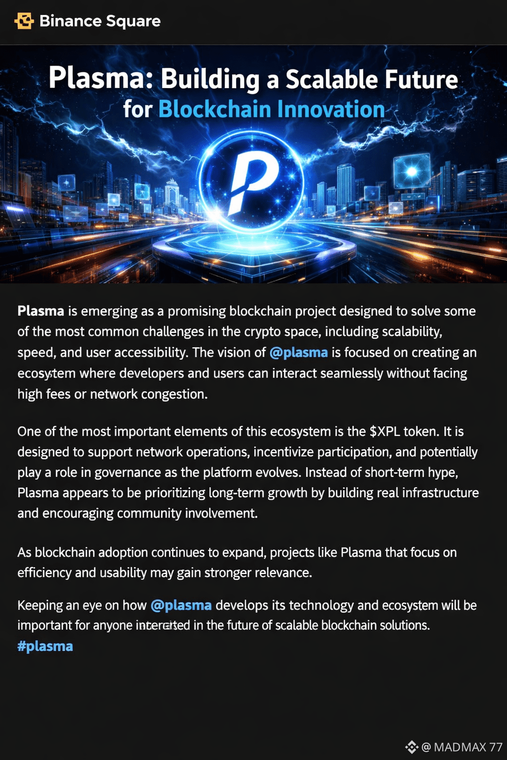 Plasma is emerging as a promising blockchain project designed to solve some of the most common challenges in the crypto space, including scalability, speed, and user accessibility. The vision of @plasma is focused on creating an ecosystem where developers and users can interact seamlessly without facing high fees or network congestion.
