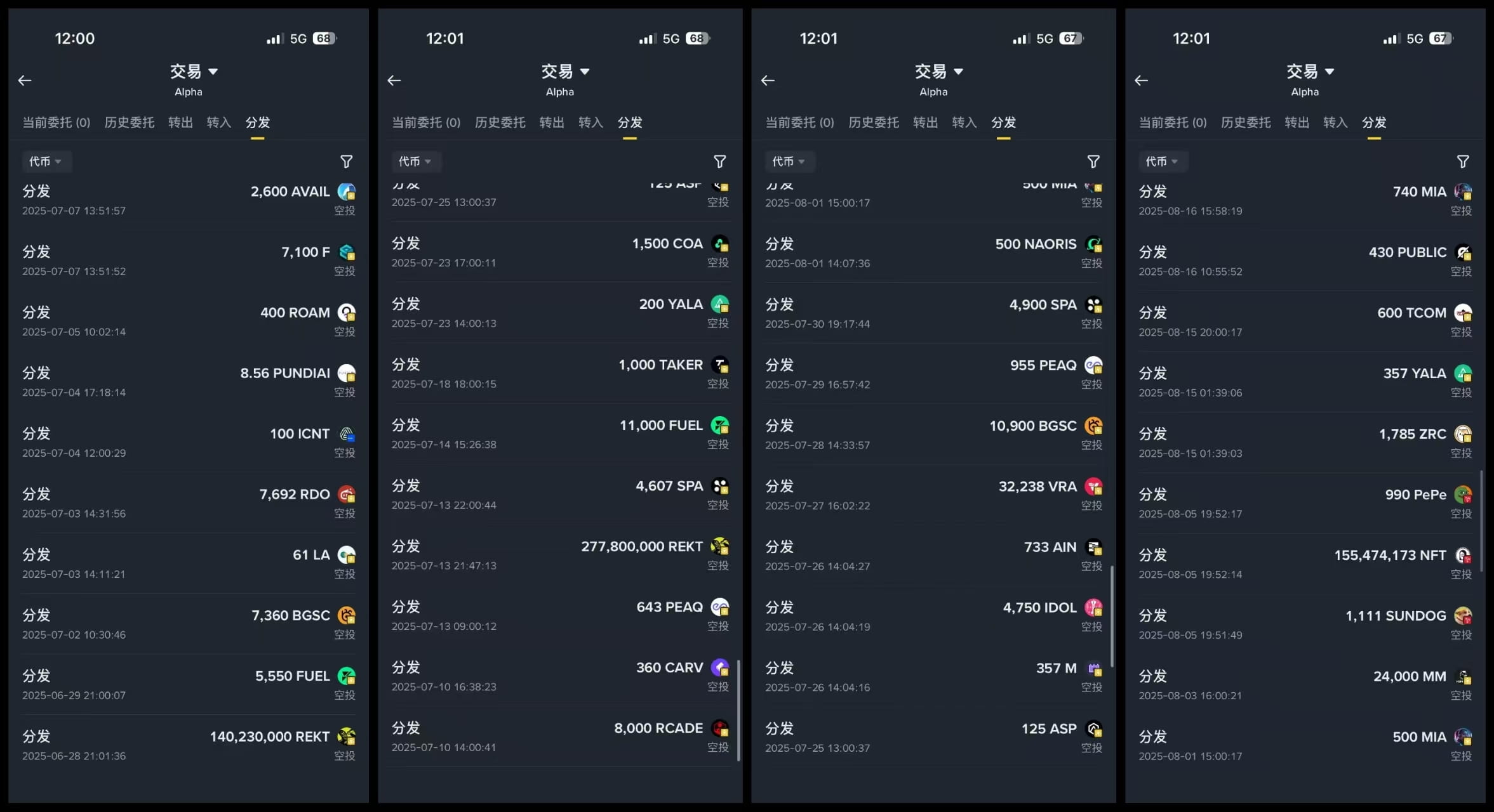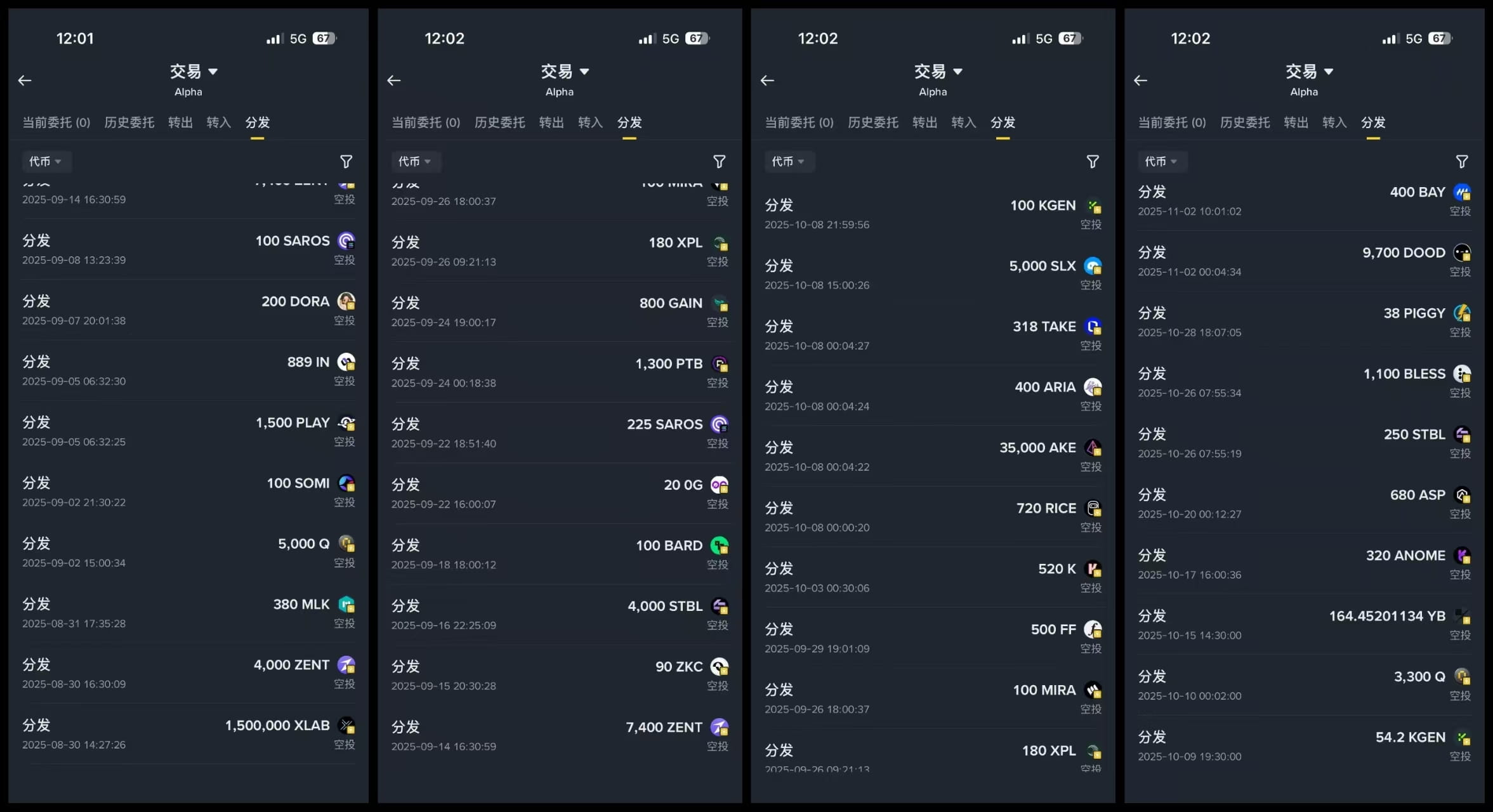 今天是26年1月18号,看了一下一月份的alpha收益,只能用惨淡来形容,吃分领到的只有两个空投,因为交易赛的贬值,交易赛也是堪堪覆盖每日刷alpha的成本。可以看我的截图,21号之后的空投只有两个是领的,esim和brev,其他都是充值或者交易赛的奖励,也就是说一个月只领到两个,fogo我没有打,认购3.5亿我觉得赔率不高,没想到现货开盘还不错,虽然现在已经跌破了发行价,因此这一个月我的收益就是100U,这还是我打了交易赛的情况,没有打交易赛的朋友,千U低保号估计是堪堪回本。