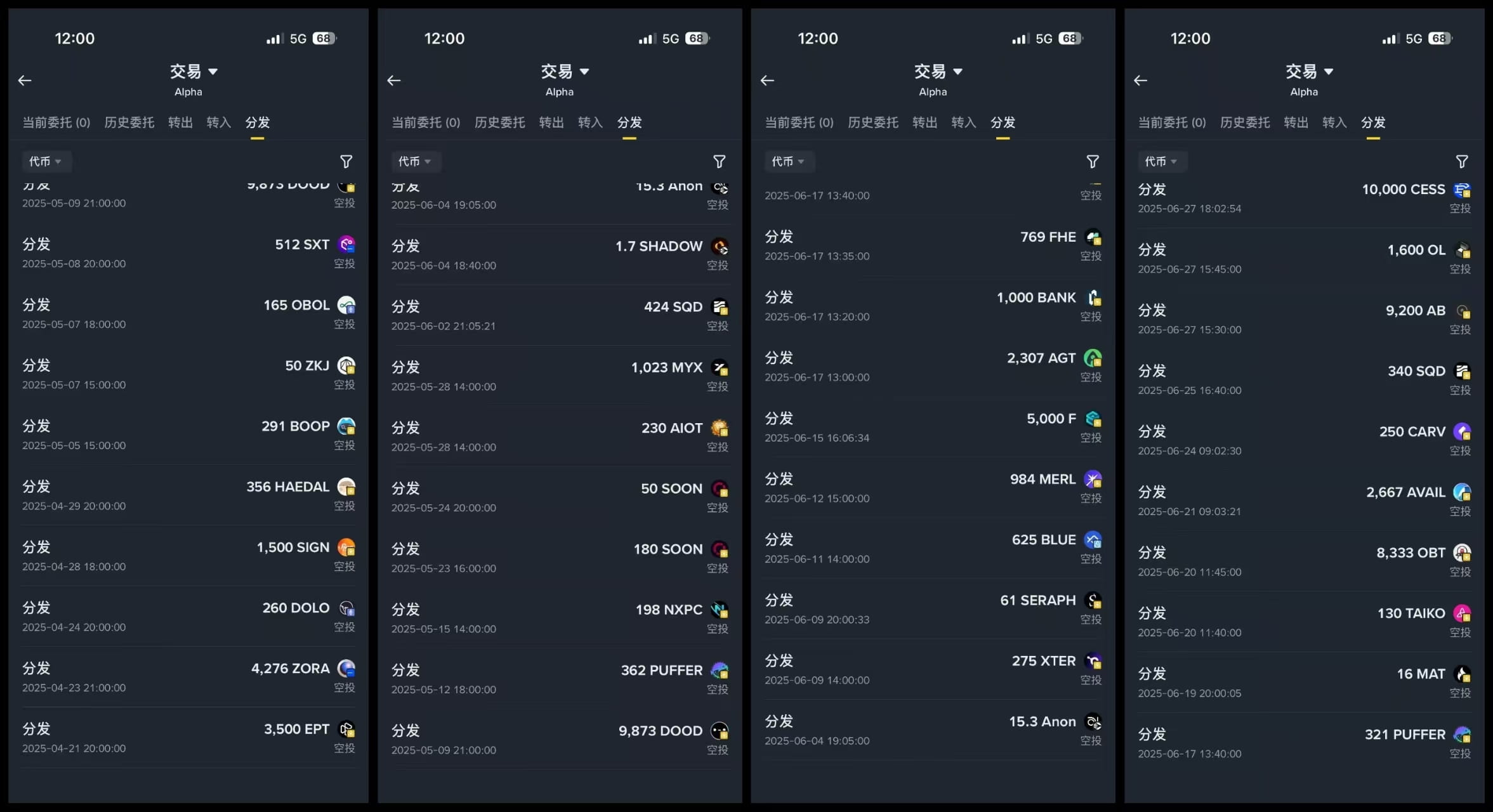 是项目方要开始收割了吗,我不知道,我只知道从3月份的prompt和4月初的gm。我开始布局币安alpha,直到4月21号alpha空投 EPT,到今天我已经坚持了将近九个月,从未段过一天,alpha已经成为我的工作,我也确实在alpha上收获了不少,单号一万U应该是有的,alpha是无本金或者低本金用户积累资金的最佳渠道,简单易上手,规则明确。
