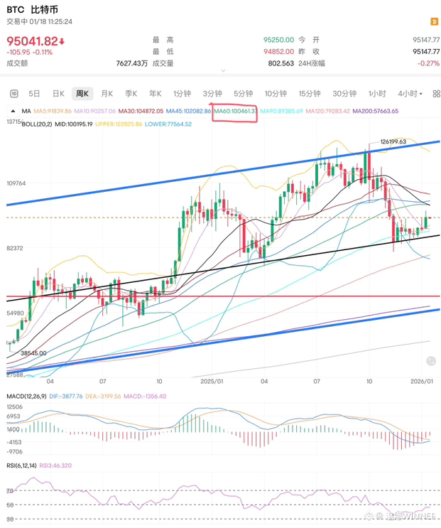 反观 $BTC 的K线图表,我个人比较重视的是周K线的MA60均线(这个位置有点微妙,但这是一篇需要长篇大论的大话题,不适合一并写在这篇帖子里),而BTC接触到周MA60的时间也大约需要两周左右,时间点接近2月1日附近。
