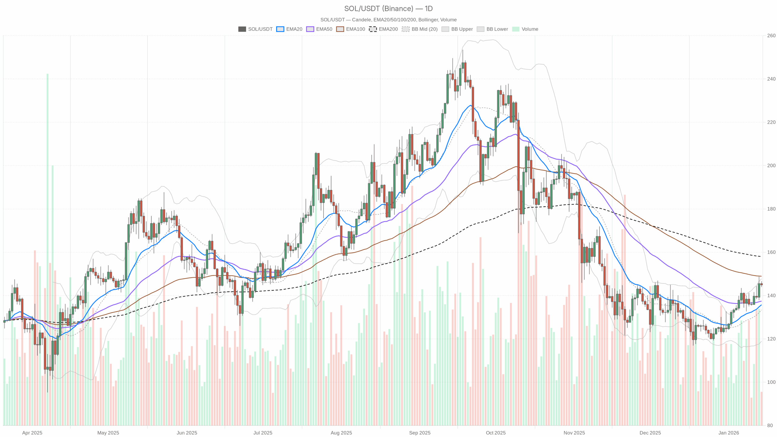 Baseline neutrale: SOL sembra bloccato in un intervallo con acquirenti e venditori bloccati a breve–medio termine, rendendo possibili breakout in entrambe le direzioni a breve.