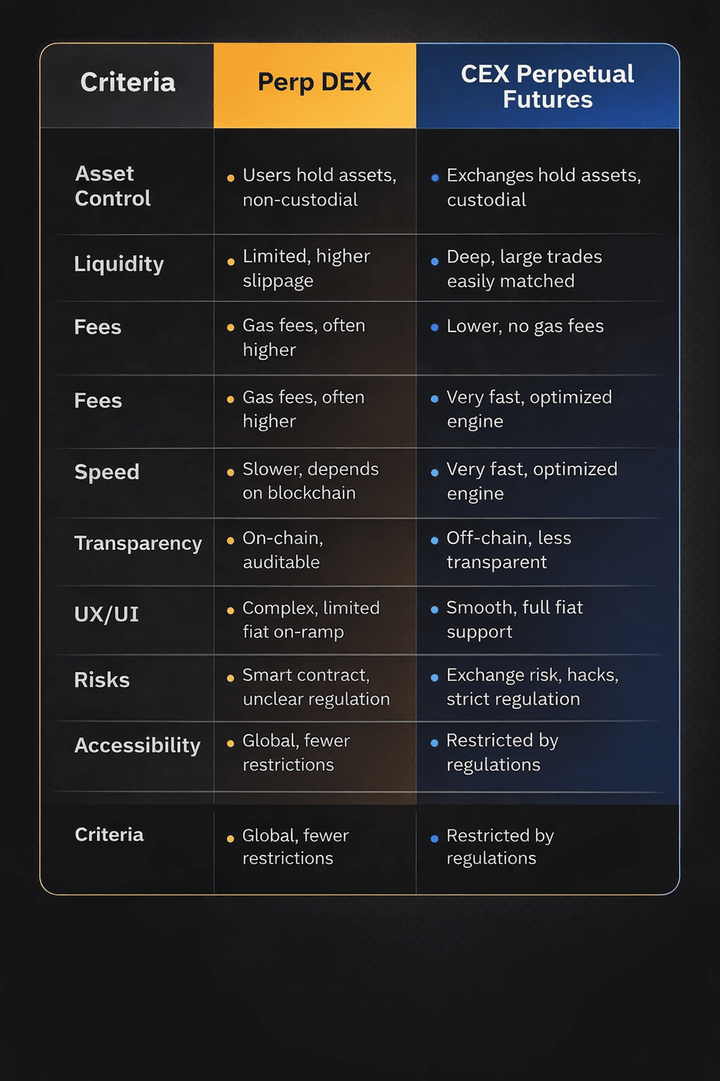 I Perp DEX e i futures perpetui CEX si trovano agli opposti dello spettro, ognuno con i propri compromessi.