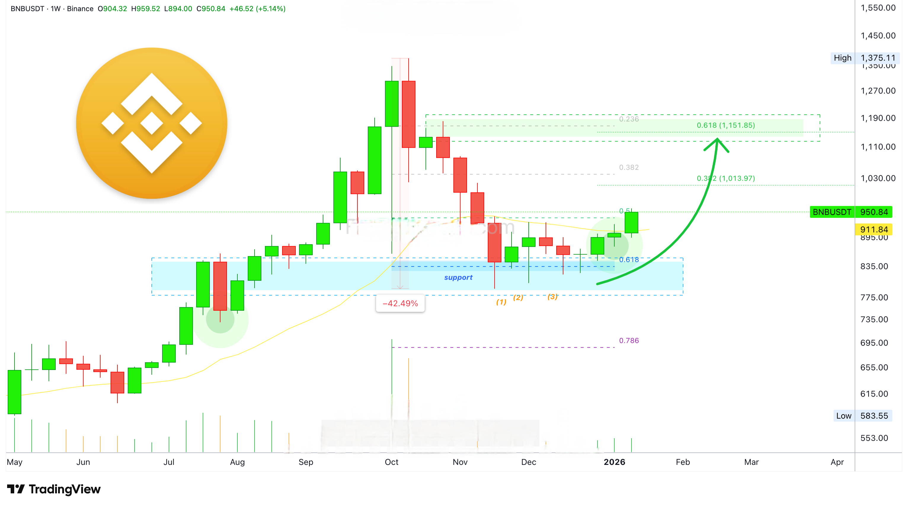 Quindi il basso è avvenuto nella settimana del 17-novembre 2025, 21-nov., e l'azione sta sempre avvenendo sopra il supporto—spazio blu nel grafico insieme al livello di ritracciamento di fib. 0.618. Nota come BNB è ora completamente verde, la candela più grande dall'inizio di questo recupero, mentre si muove sopra EMA21 (linea gialla).